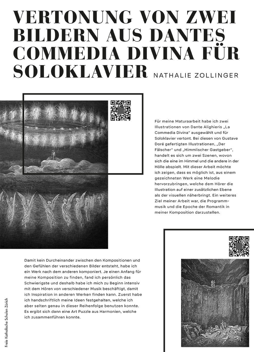 Für meine Maturaarbeit habe ich zwei Illustrationen von Dante Alighieris «La Commedia Divina» genommen und für Soloklavier vertont. Bei diesen von Gustave Doré gefertigten Illustrationen handelt es sich um zwei Szenarien, die eine spielt sich in der Hölle ab und die andere im Himmel. In dieser Arbeit möchte ich zeigen, dass es möglich ist, aus einem gezeichneten Werk eine Melodie hervorzubringen, welche dem Hörer die Illustration auf einer anderen Eben als nur der visuellen näherbringt.