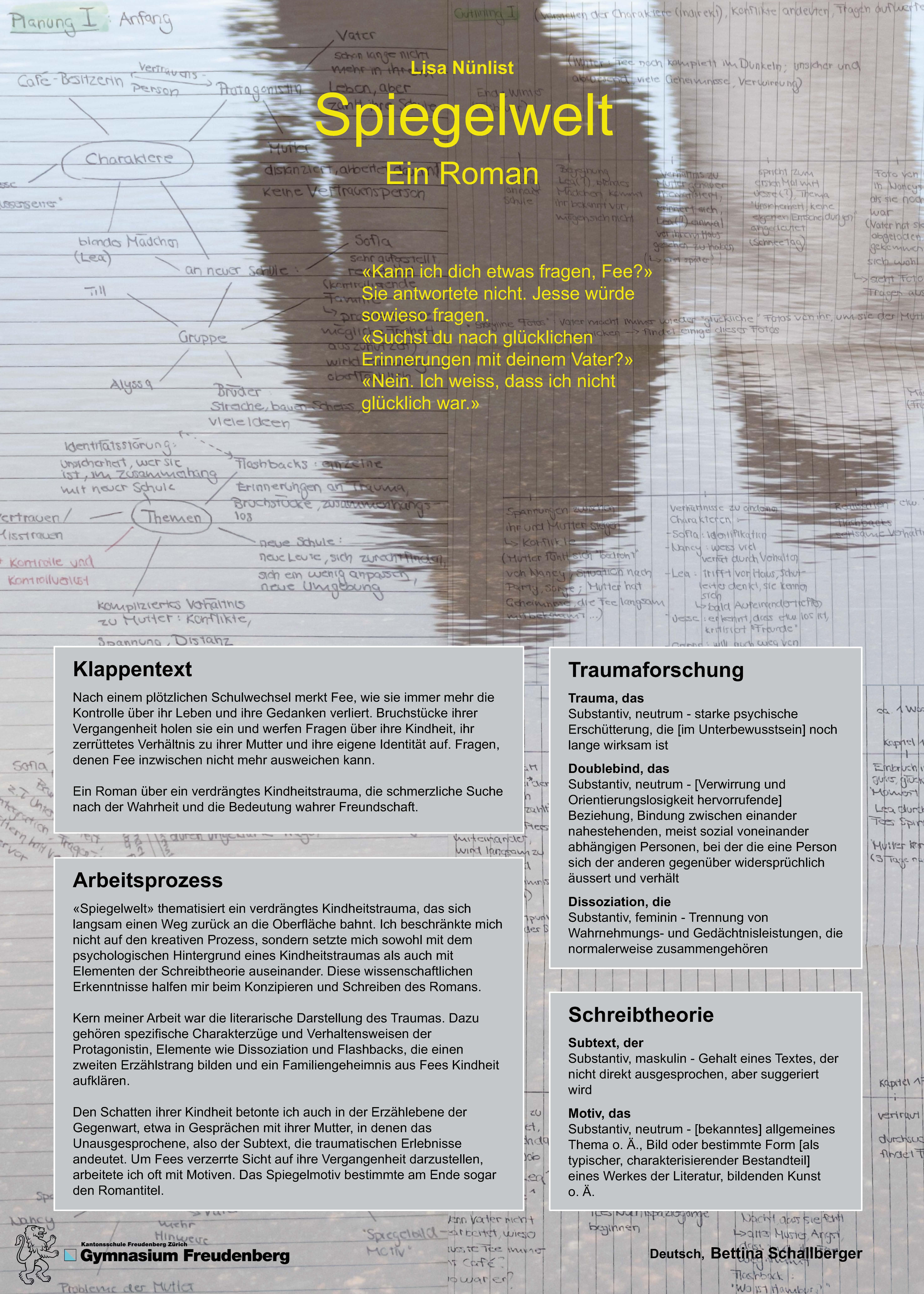 Im Rahmen meiner Maturitätsarbeit schrieb ich einen eigenen Roman. Die Geschichte sollte kreativ, aber auch möglichst authentisch sein. Deshalb habe ich mich einerseits mit den psychologischen Hintergründen eines Kindheitstraumas beschäftigt. Andererseits setzte ich mich mit verschiedenen Elementen der Schreibtheorie auseinander. Die Protagonistin Fee wurde in ihrer Kindheit emotional misshandelt – ihr Vater führte ein Doppelleben und benutzte Fee als Alibi, um die Affäre vor Fees Mutter zu verstecken. Diese Erfahrung verdrängte Fee als Teil der Dissoziation, eine Störung, bei der die Erinnerung an traumatische Erlebnisse blockiert wird. Die Vergangenheit ist jedoch nicht abgeschlossen, sondern nur abgespalten. So bahnt sich die Erinnerung viele Jahre nach den Ereignissen mit Fees Vater langsam einen Weg zurück an die Oberfläche. Mithilfe der Technik des personalen Erzählens decken die Leser*innen das Geheimnis von Fees Vergangenheit sozusagen mit ihr zusammen auf. Das verdrängte Trauma kehrt langsam zurück, indem sich immer mehr Bruchstücke zusammensetzen. Gleichzeitig zeichnen sich die Folgen des Traumas immer deutlicher ab, beispielsweise in Fees Identitätsstörungen, welche ein wiederkehrendes Motiv des Romans sind. Ich habe mit zwei Erzählsträngen gearbeitet, der Gegenwart und Flashbacks aus der Kindheit: Erinnerungsschleier, manchmal bloss Sätze, manchmal ganze Szenen, die durch Trigger hervorgerufen werden und sich irgendwann mit der Gegenwart vermischen, da in Fees gegenwärtigem Leben immer mehr Parallelen zu ihrer Vergangenheit entstehen. Diese Flashbacks klären das Geheimnis auf und erklären zugleich Fees gegenwärtiges Verhalten, ihre Ängste und Entscheidungen. Am Ende des Romans realisiert Fee, dass sie mit der Vergangenheit endlich abschliessen muss. Die Spiegelwelt zerbricht.