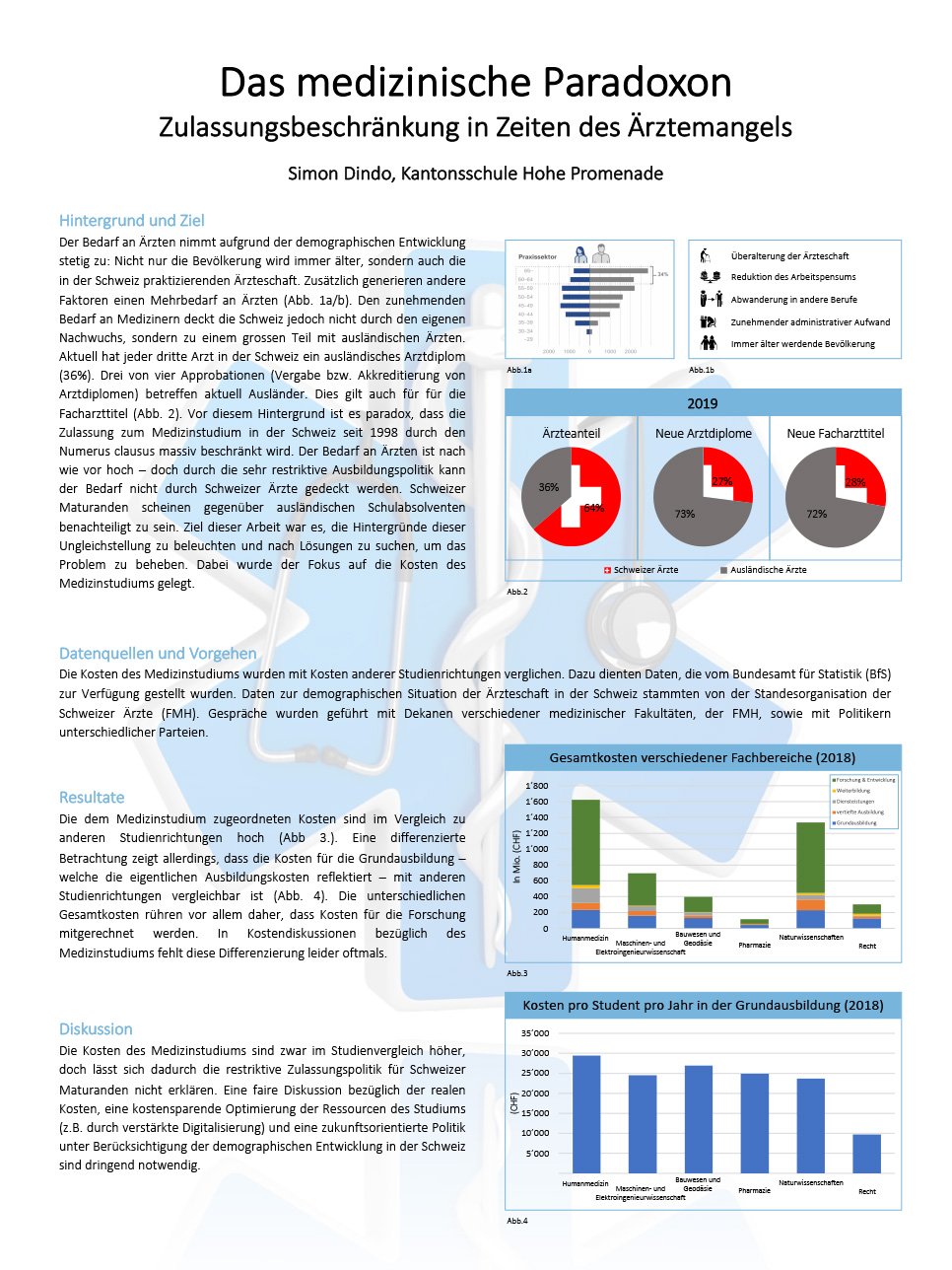 Hintergrund Der Bedarf an Ärzten nimmt aufgrund der demographischen Entwicklung stetig zu. Den zunehmenden Bedarf deckt die Schweiz vornehmlich mit ausländischen Ärzten. Aktuell hat jeder dritte Arzt ein ausländischen Arztdiplom. Über dreiviertel aller Approbationen betreffen aktuell Ausländer. Vor diesem Hintergrund ist es paradox, dass die Zulassung zum Medizinstudium in der Schweiz beschränkt wird. Durch die restriktive Ausbildungspolitik kann der Bedarf nicht durch Schweizer Ärzte gedeckt werden. Ziel dieser Arbeit war es, die Hintergründe dieser Politik zu beleuchten und nach Lösungen zu suchen, um dieses Problem zu beheben. Dabei wurden speziell die Kosten des Medizinstudiums analysiert. Datenquellen und Vorgehen Die Kosten des Medizinstudiums wurden mit anderen Studienrichtungen verglichen. Dazu dienten die Daten des Bundesamts für Statistik (BfS). Demographische Daten stammten von der FMH. Gespräche wurden geführt mit Dekanen verschiedener medizinischer Fakultäten, dem Präsidenten der FMH sowie mit Politikern unterschiedlicher Parteien. Resultate Die dem Medizinstudium zugeordneten Kosten sind im Vergleich zu anderen Studienrichtungen hoch. Eine differenzierte Betrachtung zeigt allerdings, dass die Kosten für die Grundausbildung mit anderen Studienrichtungen vergleichbar ist. Diskussion Die Kosten des Medizinstudiums sind zwar im Studienvergleich höher, doch lässt sich dadurch die restriktive Zulassungspolitik für Schweizer Maturand*innen nicht erklären. Eine faire Diskussion bezüglich der realen Kosten, eine kostensparende Optimierung der Ressourcen und eine zukunftsorientierte Politik unter Berücksichtigung der demographischen Entwicklung in der Schweiz sind dringend notwendig.