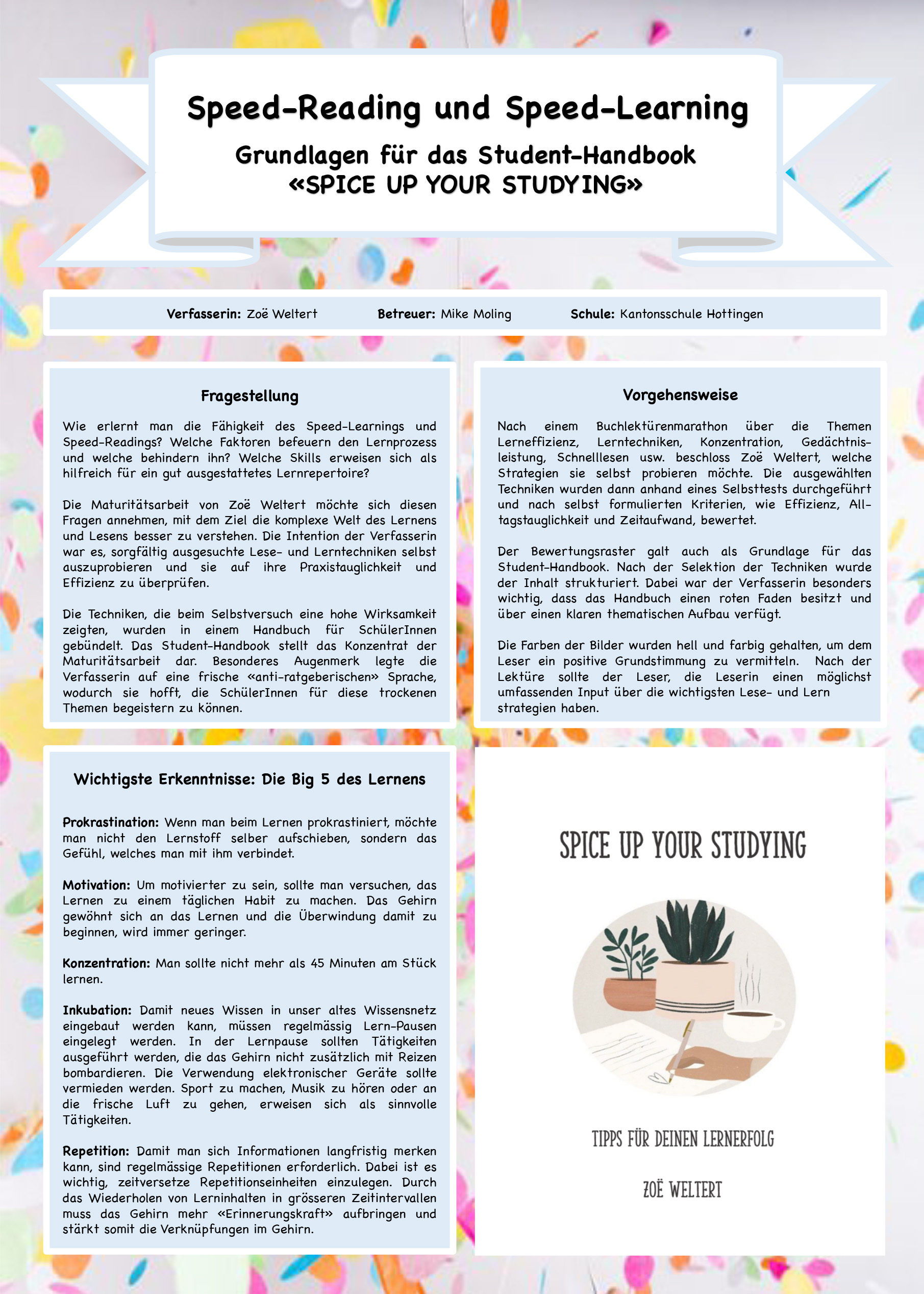 Beim Schreiben meiner Maturitätsarbeit habe ich meinen Fokus auf die Themen Speed-Reading und Speed-Learning gerichtet. Nach dem Eintauchen in die mir bis dato unbekannte Welt des Speed-Readings und des Speed-Learnings kristallisierten sich zwei grundlegende Fragestellungen heraus: 1. Was gibt es für Techniken, die einen zu einem Schnellleser machen? 2. Was gibt es für Lerntechniken, um effizienter lernen zu können? Ich verfolgte den Ansatz, mich über den Ursprung und die Katalysatoren von Lese- und Lernfrust zu informieren. Meine Absicht war es, mir genügend Wissen anzueignen, um die mir am wichtigsten erscheinenden und von mir selbst getesteten Lese- und Lernmethoden in einem Handbuch für Schüler*innen zu bündeln. Das Verwenden einer frischen, jugendlichen Sprache war mir wichtig, um die eher trockenen Themengebiete zum Leben zu erwecken. Dabei sollte das Handbook den Lernenden, metaphorisch gesprochen, an die Hand nehmen und ihm helfen, den manchmal steinigen Weg des Lernens zu beschreiten. Präsentiert sich eine Hürde, soll das Handbook einen guten Tipp geben können, um dieses Hindernis mit Bravour zu überwinden. Das Handbook umfasst Themen wie die perfekte Vorbereitung zum Lernen, wie man aus einem Motivationstief herauskommt, wie man in Prüfungssituationen gelassener sein kann, und noch viele weitere Tipps und Tricks, um eine gewisse Leichtigkeit in den Lernalltag zu bringen.