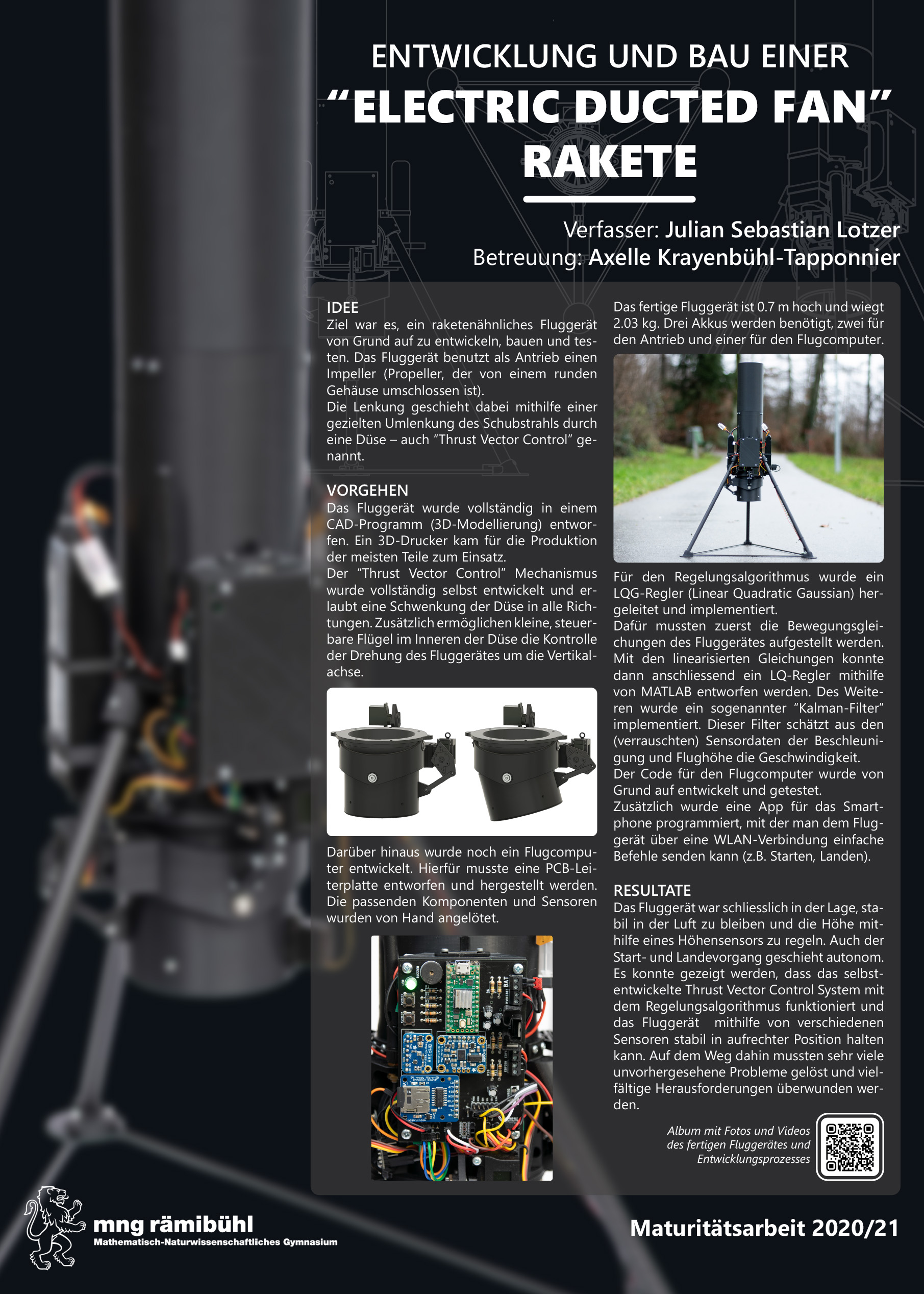 Ziel dieser Arbeit ist es, ein VTOL (Vertical Take-Off and Landing) Fluggerät zu bauen, welches modellhaft die Steuerung einer Rakete simuliert. Als Antrieb wird ein Impeller (ein von einer Röhre umschlossener Propeller, auch Electric Ducted Fan, kurz: EDF genannt) verwendet. Dabei wird eine sogenannte Thrust-Vector-Control-Steuerung (Schubvektorensteuerung) benutzt, die u.a. auch die Raketen von Raumfahrunternehmen wie SpaceX, Blue Origin, Masten Space Systems verwenden, um präzise Start- und Landungsmanöver durchzuführen. Das ganze Fluggerät sollte von Grund auf selbst entwickelt werden. Dafür wurden die meisten Bauteile in einem CAD-Programm modelliert und 3D-gedruckt. Auch wurde für das Gerät ein eigener Flugcomputer mit unterschiedlichen Sensoren und Hardware entwickelt und produziert. Um halbautonomes Fliegen zu ermöglichen, wurde ein LQG-Controller (linear-quadratic-gaussian regulator) hergeleitet und implementiert. Das Fluggerät war schliesslich wirklich in der Lage, stabil in der Luft zu bleiben und die Höhe autonom zu regeln. Auf dem Weg dahin mussten viele Probleme gelöst und vielfältige Herausforderungen überwunden werden.