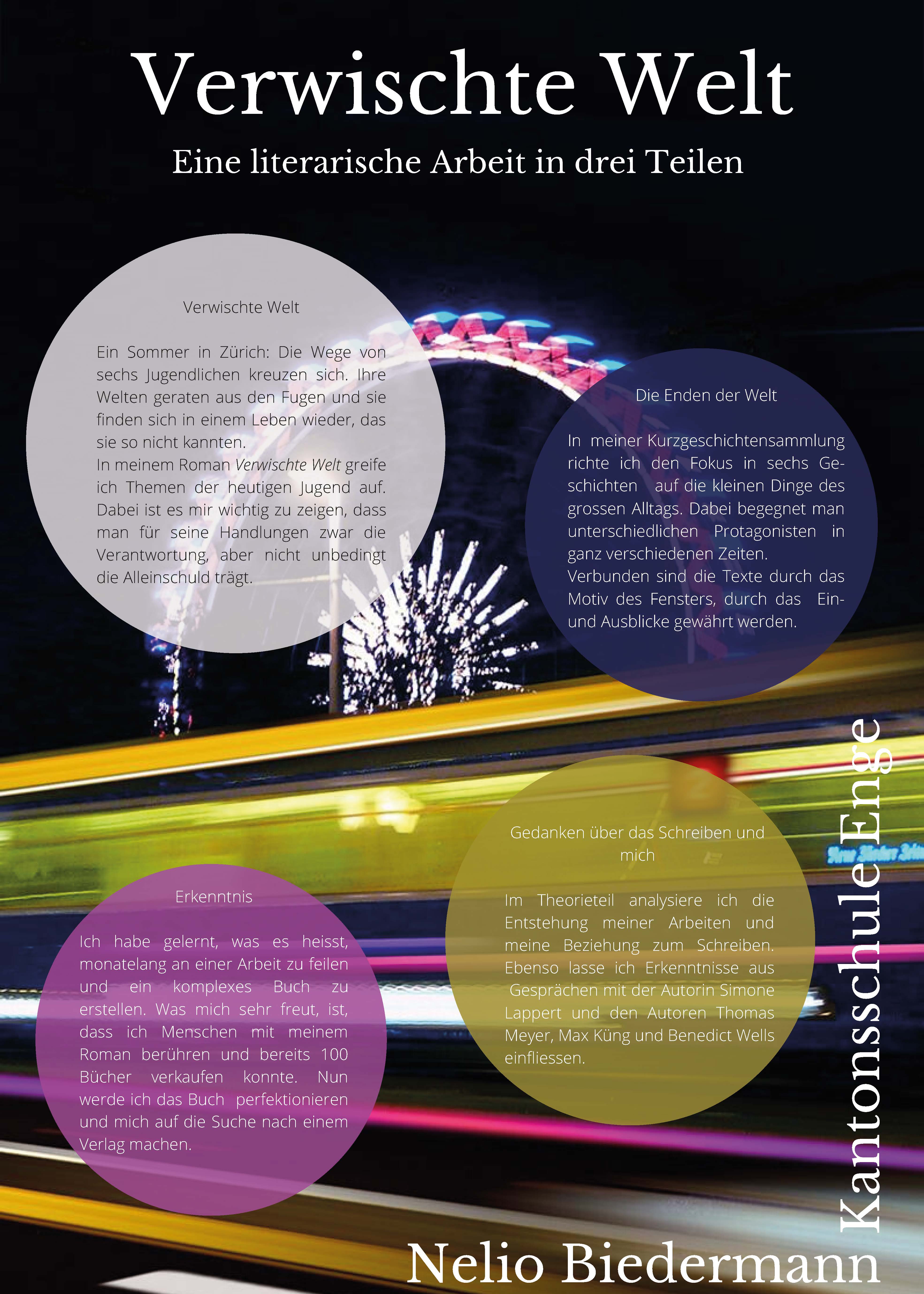 Ein Sommer in Zürich: Die Wege von sechs Jugendlichen kreuzen sich. Ihre Welten geraten aus den Fugen und sie finden sich in einem Leben wieder, das sie so nicht kannten. Nelio Biedermann schrieb mit Verwischte Welt einen Roman über Schicksalsschläge und die Frage nach der Schuld. Er zeigt auf, wie schnell das Leben aus dem Gleichgewicht geraten kann und wie wichtig es ist, sich selbst zu kennen und sich nicht zu verlieren. Er erzählt die Geschichten seiner Protagonisten mit viel Einfühlungsvermögen und Detailbeobachtungen. Dabei hat er den Mut, auch herausfordernde Momente im Leben seiner Figuren schonungslos zu beleuchten, und schreckt vor Themen wie Verlorenheit, Gewalt, Liebe, Trauer und Missbrauch nicht zurück. Zudem gelingt es ihm, den Leser immer wieder mit neuen Metaphern zu überraschen und wunderbare Bilder entstehen zu lassen. Nebst dem Buch verfasste Nelio einen Kurzgeschichtenband. In Die Enden der Welt greift er verschiedene Blickwinkel, Themen und Zeiten auf und richtet das Augenmerk auf die kleinen Dinge des grossen Alltags. Für den Theorieteil Gedanken über das Schreiben und mich führte er Gespräche mit der Autorin Simone Lappert sowie den Autoren Thomas Meyer, Max Küng und Benedict Wells. Er verarbeitete diese in einem essayistischen Theorieteil und gewährte so einen tiefen Einblick in seine Gefühle und Gedanken.