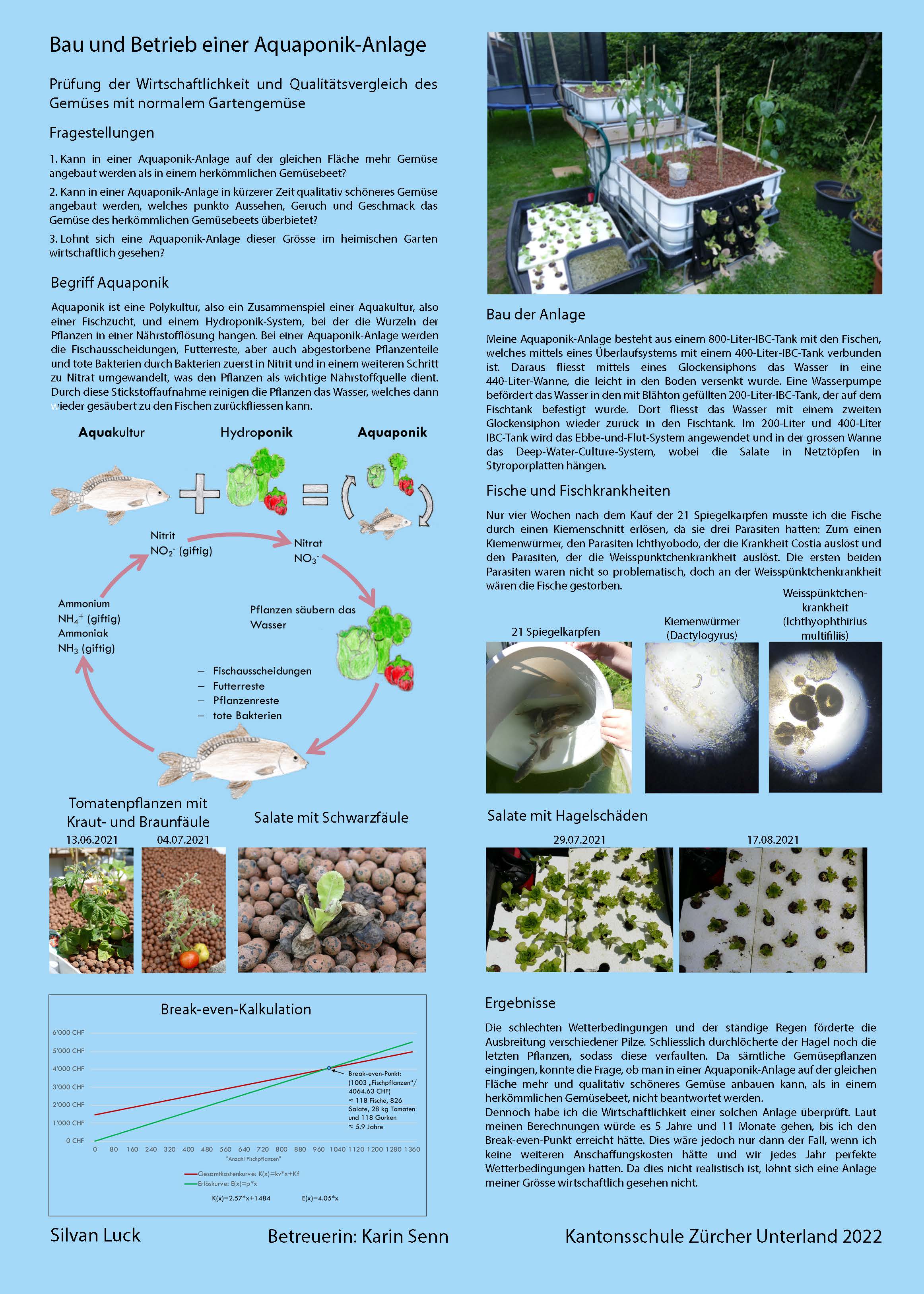 Eine Aquaponik-Anlage ist ein Kreislaufsystem, bei dem die Pflanzen und Fische beide voneinander profitieren. Das Ziel eines Aquaponik-Systems ist die Wiederverwertung der Nährstoffe in den Fischausscheidungen und im Fischfutter, um so Pflanzen anzubauen. Da eine Aquaponik-Anlage keinen zusätzlichen Dünger oder Pestizide braucht, ist eine solche Anlage auch ökologisch sinnvoll, zudem spart man durch dieses Kreislaufsystem sehr viel Wasser. Mit dem Bau und Betrieb einer Aquaponik-Anlage wollte ich die Frage beantworten, ob sich eine Aquaponik-Anlage dieser Grösse im heimischen Garten lohnt und sie in kürzerer Zeit mehr Ertrag liefert, welches qualitativ besser ist als ein Gemüsebeet, das auf herkömmliche Weise betrieben wurde. Um diese Fragestellung zu überprüfen, wurde die Anlage gebaut und ein herkömmliches Gemüsebeet in Betrieb genommen. Leider war mein Vergleichsbeet auch bei den Schnecken sehr beliebt und wurde schliesslich zur Brutstätte diverser Nacktschnecken, sodass ich auf Töpfe umsteigen musste. Auch meine 21 Spiegelkarpfen mussten bereits nach vier Wochen erlöst werden, da sie drei verschiedene Parasiten hatten. Die schlechten Wetterbedingungen und der ständige Regen führten dazu, dass meine Pflanzen alle an Pilzen erkrankten und schliesslich eingingen. Die Anlage wurde neu bepflanzt, doch nur zwei Wochen später durchlöcherte der Hagel meine Pflanzen und sie verfaulten schliesslich. Kurz zusammengefasst, konnte ich letztes Jahr kein Gemüse ernten. Auch die Überprüfung der Wirtschaftlichkeit ergab, dass sich eine Aquaponik-Anlage von meiner Grösse im heimischen Garten nicht lohnt.