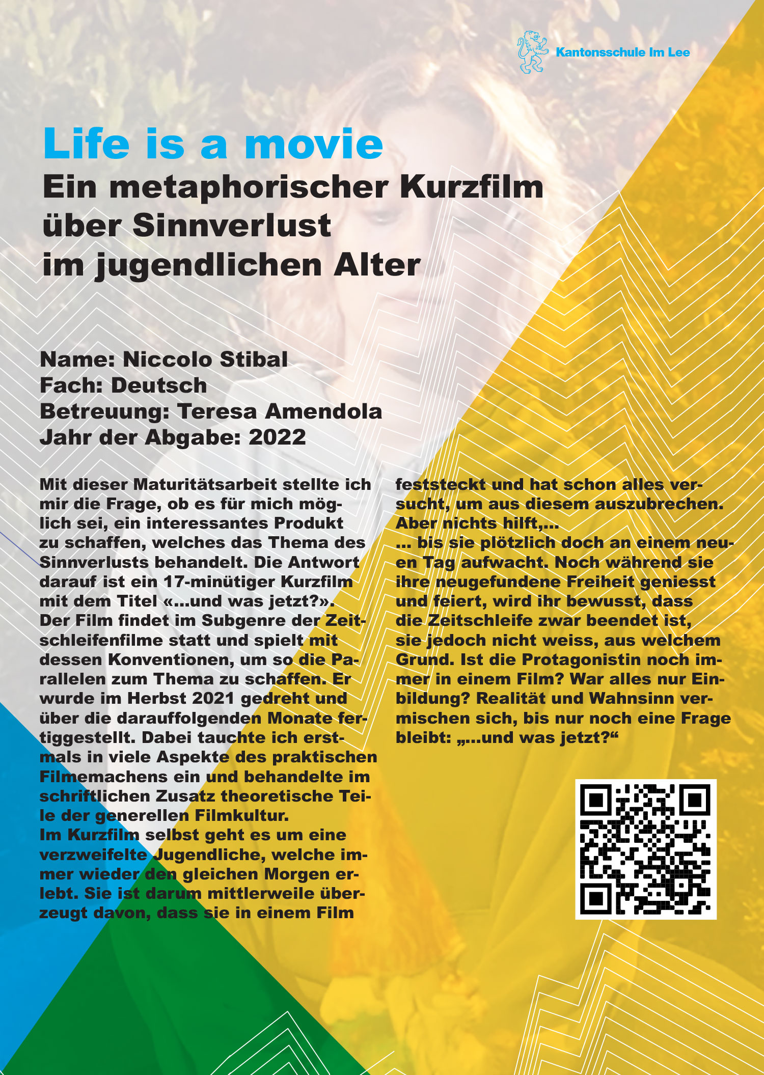 Mit dieser Maturitätsarbeit stellte ich mir die Frage, ob es für mich möglich sei, ein interessantes Produkt zu schaffen, welches das Thema des Sinnverlusts behandelt. Die Antwort darauf ist ein 17-minütiger Kurzfilm mit dem Titel …und was jetzt?. Der Film findet im Subgenre der Zeitschleifenfilme statt und spielt mit dessen Konventionen, um so die Parallelen zum Thema zu schaffen. Er wurde im Herbst 2021 gedreht und über die darauffolgenden Monate fertiggestellt. Dabei tauchte ich erstmals in viele Aspekte des praktischen Filmemachens ein und behandelte im schriftlichen Zusatz theoretische Teile der generellen Filmkultur. Im Kurzfilm selbst geht es um eine verzweifelte Jugendliche, welche immer wieder den gleichen Morgen erlebt. Sie ist darum mittlerweile überzeugt davon, dass sie in einem Film feststeckt, und hat schon alles versucht, um aus diesem auszubrechen. Aber nichts hilft, bis sie plötzlich doch an einem neuen Tag aufwacht. Noch während sie ihre neugefundene Freiheit geniesst und feiert, wird ihr bewusst, dass die Zeitschleife zwar beendet ist, doch aus welchem Grund? Ist die Protagonistin noch immer in einem Film? War alles nur Einbildung? Realität und Wahnsinn vermischen sich, bis nur noch eine Frage bleibt: „…und was jetzt?“