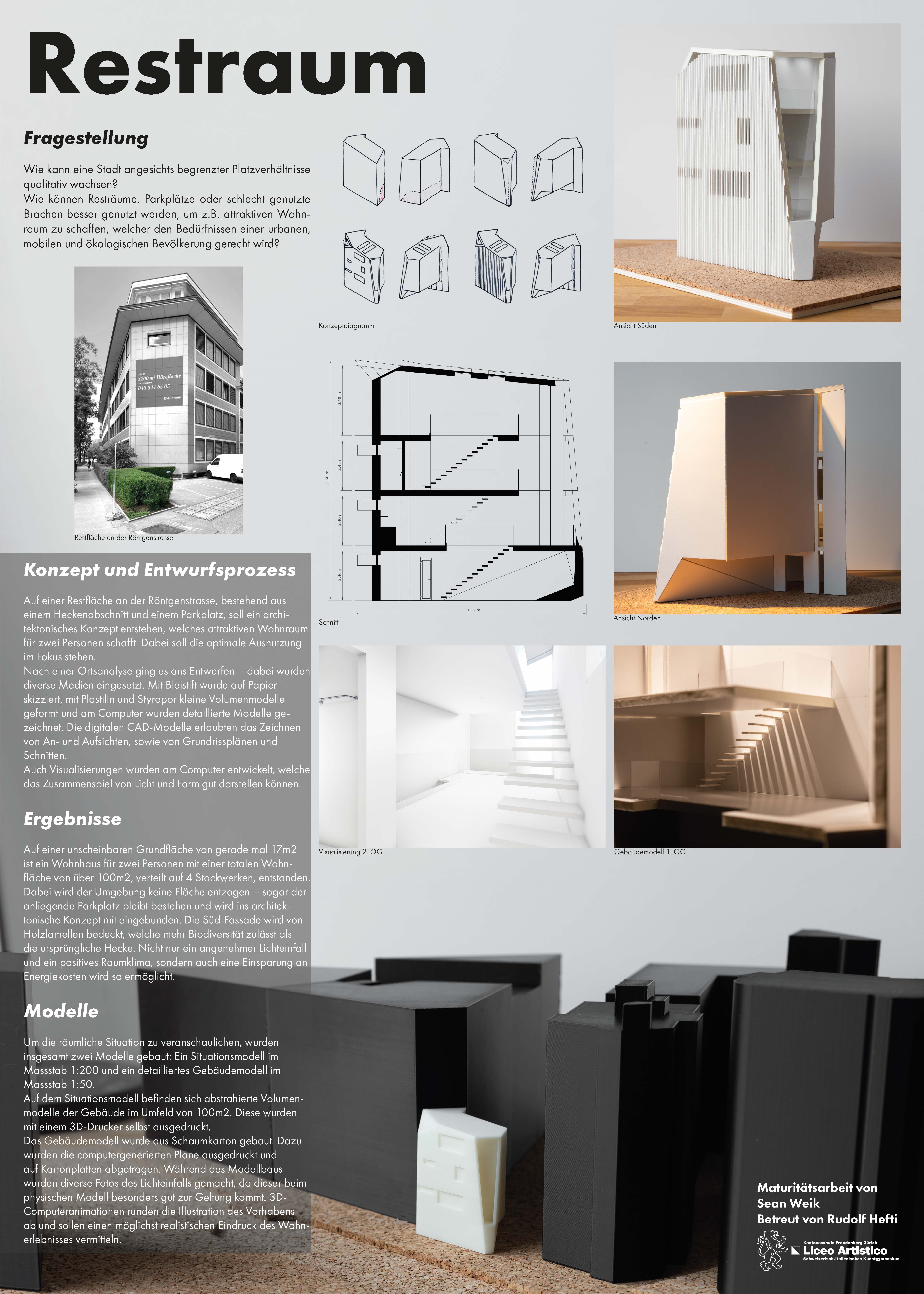 Ziel dieser Arbeit ist es, anhand eines konkreten Beispiels aufzuzeigen, wie innerstädtische Resträume genutzt werden könnten. Ein architektonisch experimenteller Ansatz soll illustrieren, wie in einem bestehenden, vermeintlich fertiggebauten Quartier der Stadt Zürich ein Heckenabschnitt und ein angrenzender Parkplatz genutzt werden könnten, um attraktiven Wohnraum für zwei Personen zu schaffen. Besonderes Augenmerk wurde dabei auf die Einbindung in das bestehende Umfeld gelegt – ein Strassenzug mit grossen Bürogebäuden und Wohnhäusern in unmittelbarer Nähe der Geleise des Zürcher Hauptbahnhofes. Auch wurde der Versuch unternommen, einen Zusatznutzen für das Quartier zu generieren, indem eine vertikale Grünfläche geschaffen werden soll und die Umnutzungen des bestehenden Parkplatzes als Car-Sharing-Station für die Anwohner vorgeschlagen wird. Neben der vorliegenden Dokumentation, welche die konzeptionellen Überlegungen, den gestalterischen Prozess sowie den Arbeitsfortschritt darstellt, wurden zwei physische Modelle angefertigt: zum einen ein Gebäude-Modell im Massstab 1:50 mit Raumaufteilung, Küche, Bad und Treppenhaus, welches einen realen Eindruck der Wohnerfahrung und der Grössenverhältnisse vermitteln soll. Im Zentrum steht dabei die Lichtführung im Inneren des Gebäudes. Um die Gesamtsituation zu illustrieren, wurde zum anderen ein vereinfachtes Situationsmodell des Quartiers im Massstab 1:200 angefertigt, das aufgrund von Geodaten, welche die Stadt Zürich zur Verfügung stellt, konstruiert und selbst auf einem 3D-Drucker hergestellt wurde.