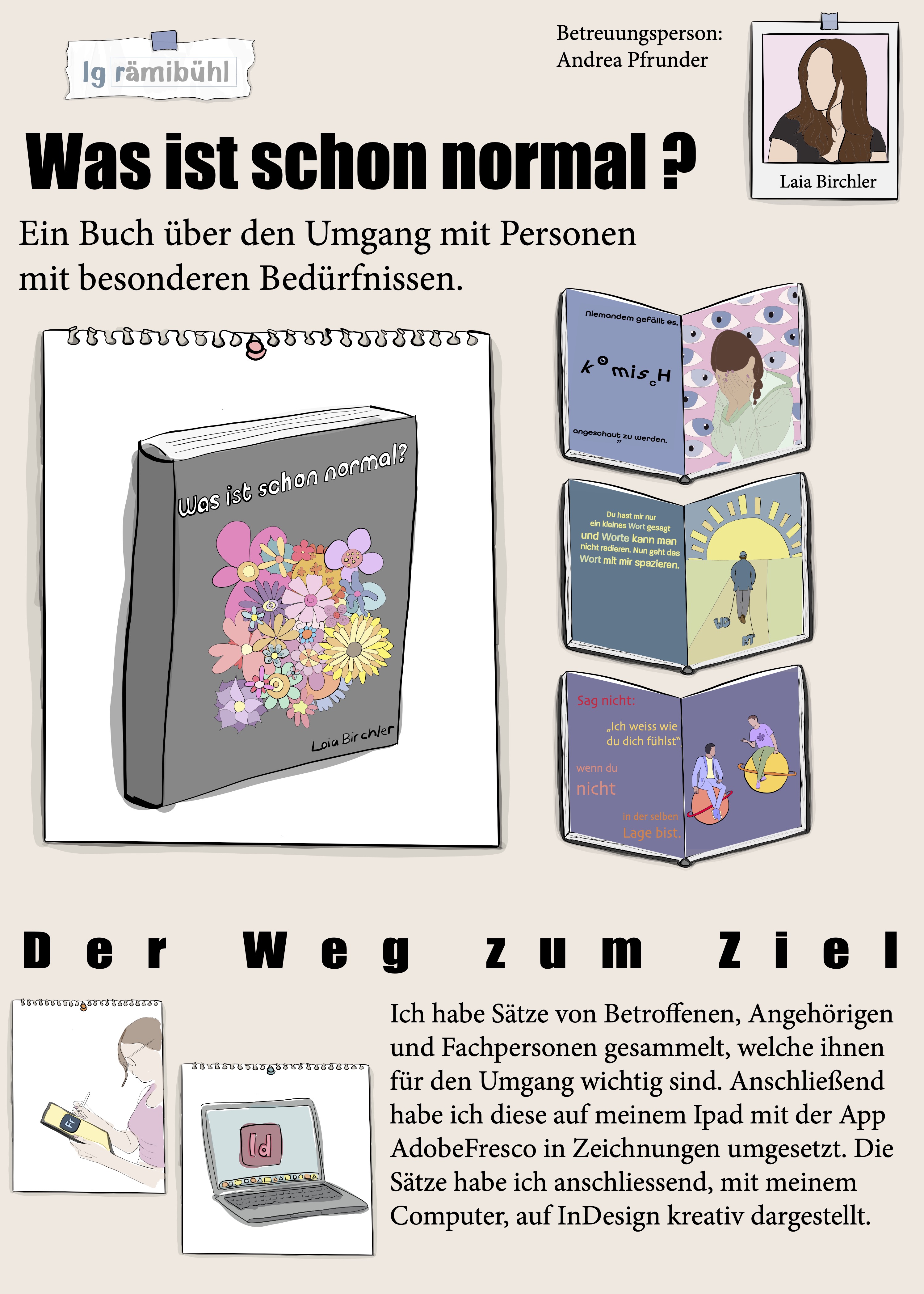 Ich habe Sätze von Betroffenen, Angehörigen und Fachpersonen gesammelt, welche ihnen für den Umgang wichtig sind. Anschließend habe ich diese auf meinem Ipad mit der App AdobeFresco in Zeichnungen umgesetzt. Die Sätze habe ich anschliessend, mit meinem Computer, auf InDesign kreativ dargestellt.