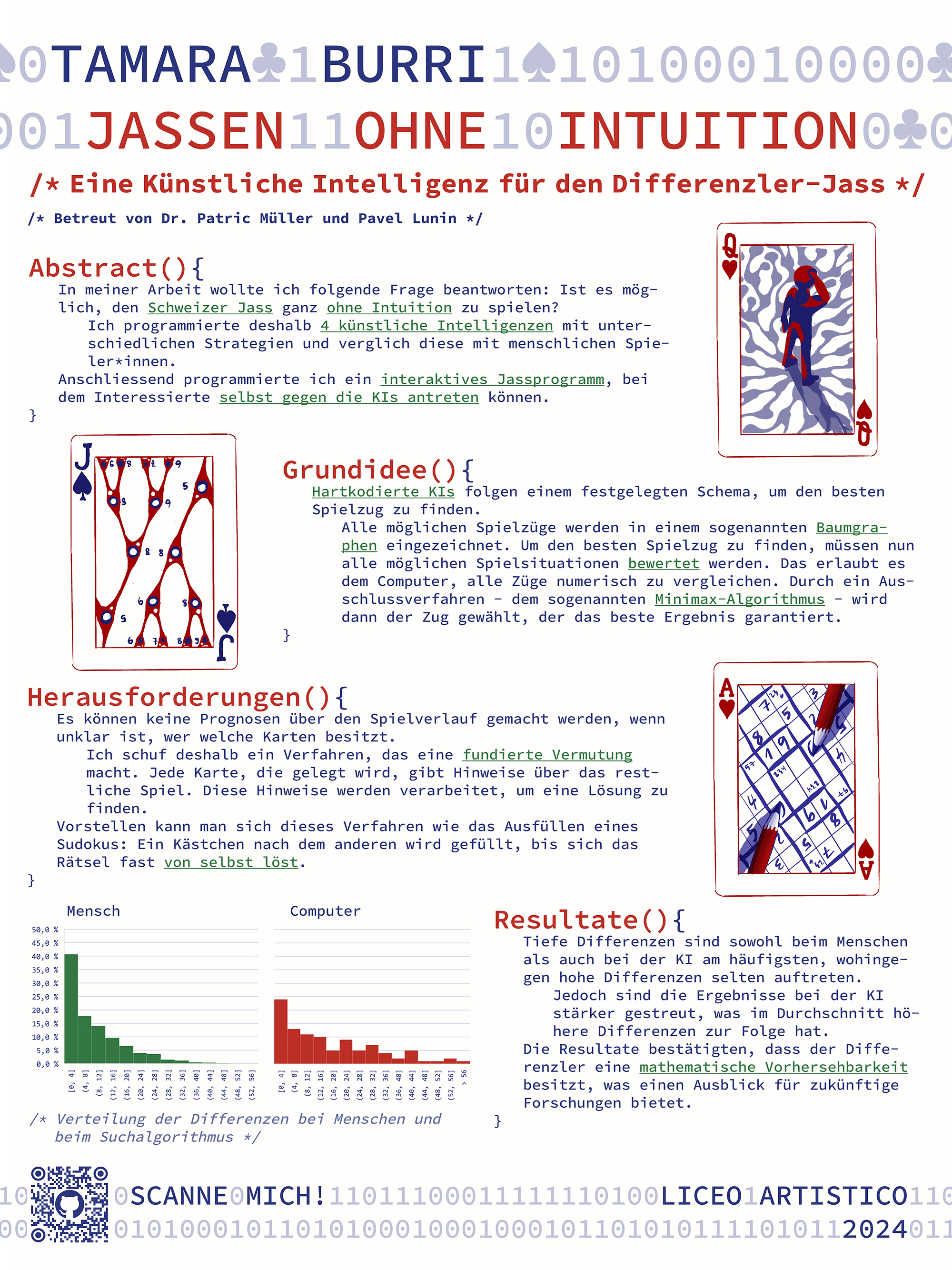 Zwar haben künstliche Intelligenzen deterministische Brettspiele wie Schach längst gemeistert, doch der Differenzler, eine Variante des Schweizer Jass, stellt eine besonders interessante Herausforderung dar, da er keine mathematisch "perfekte" Strategie besitzt. Ich wollte deshalb wissen: Kann eine künstliche Intelligenz jassen - ganz ohne Erfahrung oder Intuition?