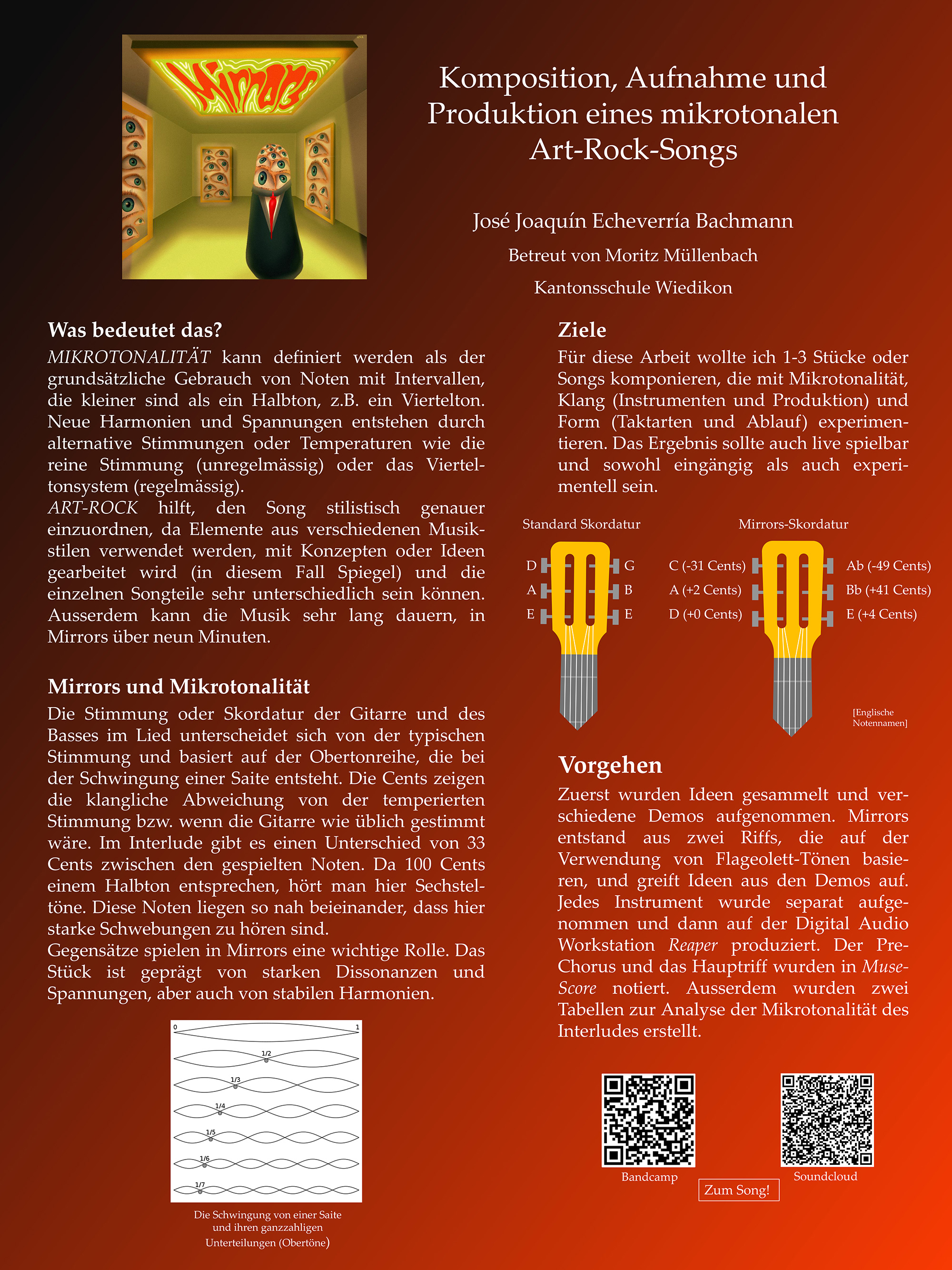 Ich hatte schon immer eine grosse Leidenschaft für Musik und wollte für diese Arbeit meine Komfortzone verlassen und gleichzeitig alles, was ich bereits kannte, nutzen, um etwas Neues zu schaffen. Der Begriff Mikrotonalität war mir schon seit einiger Zeit bekannt, und sowohl die Seltsamkeit als auch die Schönheit mikrotonaler Musikstücke haben mich neugierig gemacht. Aus diesen Gründen wollte ich für diese Arbeit ein bis drei Musikstücke komponieren, aufnehmen und produzieren, die mit Mikrotonalität, Klang (Instrumente und Produktion) und Form (Ablauf, Taktarten) experimentieren und gleichzeitig eingängig und live mit einer Band spielbar sind. «Mirrors» ist das neunminütige Produkt von Forschung, Experiment und aufwendiger Aufnahme und Produktion, selbst eingespielt (Gitarre, Bass, Schlagzeug und Gesang) und auf Reaper produziert. Der Text dieses Art-Rock-Songs befasst sich mit Gefühlen wie Gefangenschaft, Aussetzung und Ängstlichkeit, die sich auch in der Musik widerspiegeln. Die Mikrotonalität des Stückes wurde genauer analysiert und durch Tabellen über Frequenzen oder Schwebungen veranschaulicht. Letztendlich habe ich meine Ziele erreicht und obwohl ich im Nachhinein vieles anders machen würde, bin ich mit dem Endprodukt zufrieden. «Mirrors» ist auf Bandcamp und Soundcloud unter dem Künstlernamen 'José Joaquín Echeverría' verfügbar.