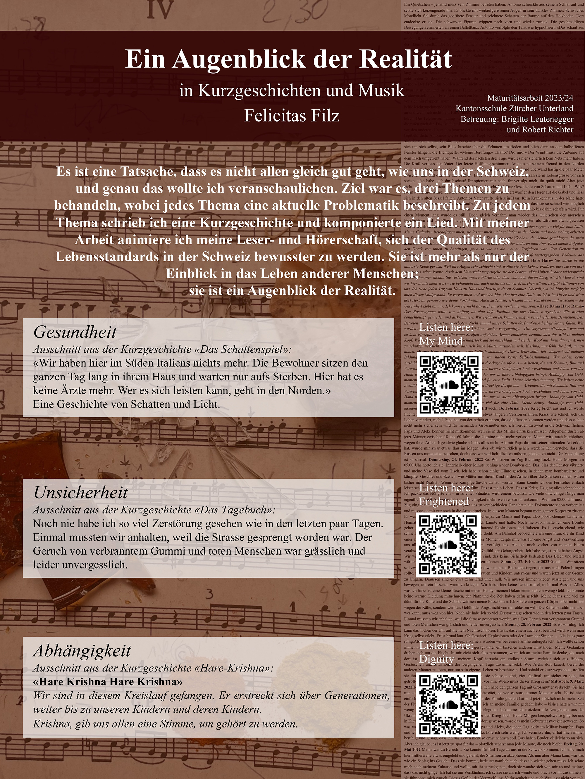 Ich legte meinen Fokus auf drei verschiedene Themen: Zu jedem Thema schrieb ich eine Kurzgeschichte und komponierte ein Lied. Meine Arbeit hat zwei Hauptqualitäten: Die eine ist die inhaltliche Aussage, die andere ist die kreative Idee von Musik und Kurzgeschichten in Kombination. Mit meiner Arbeit mache ich nicht nur auf drei aktuelle Themen aufmerksam; sie ist mehr als nur der Einblick in das Leben anderer Menschen. Sie ist ein Augenblick der Realität.
