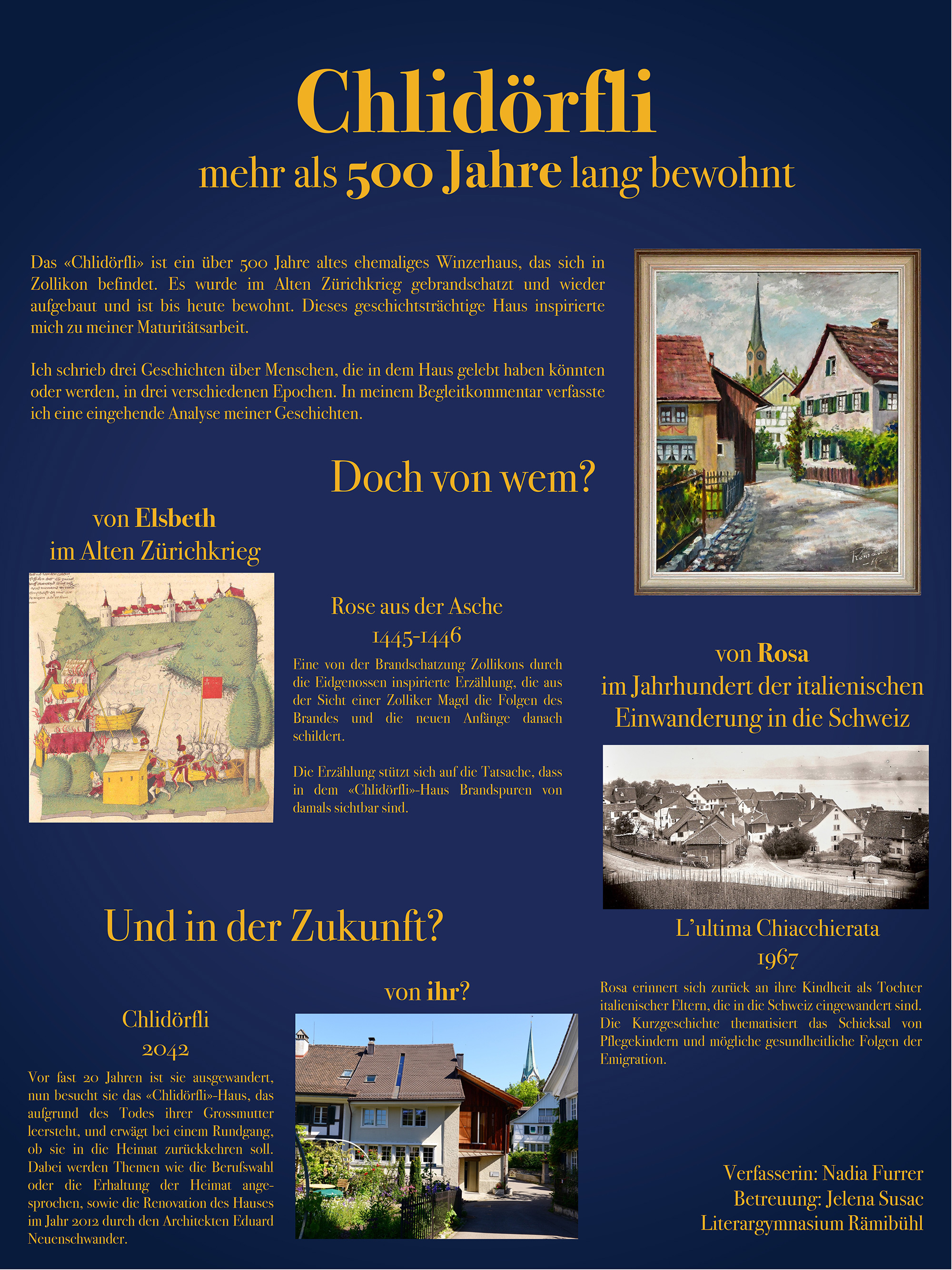 Diese Maturitätsarbeit eröffnete mir die Möglichkeit, mich intensiv mit dem Schreiben zu befassen, zu erkunden, wie historische und kulturelle Recherche vonstatten geht, und wie daraus mit etwas Fantasie eine kreative Geschichte entsteht.