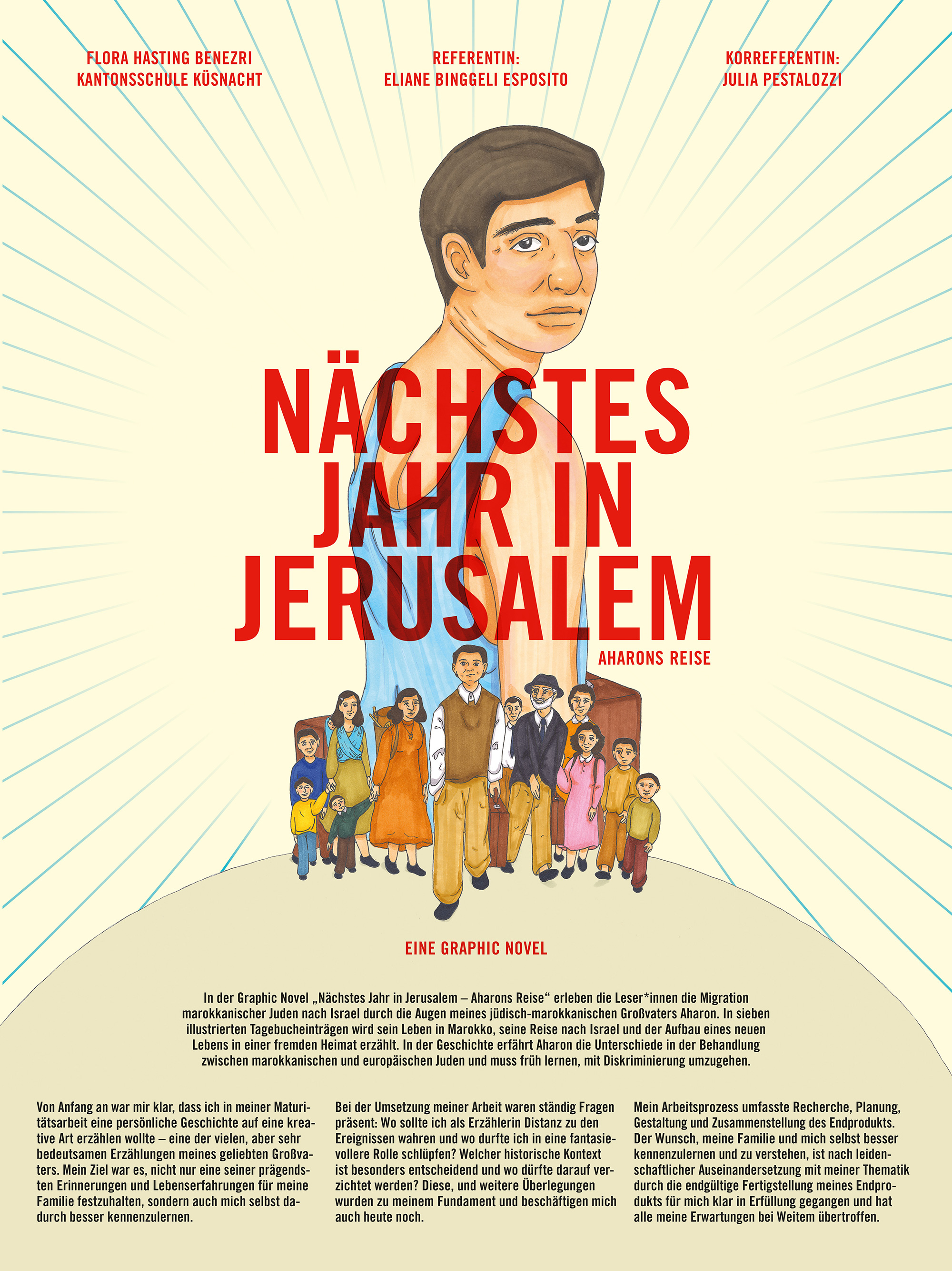 In der Graphic Novel "Nächstes Jahr in Jerusalem – Aharons Reise" wird den Leser*innen das Thema der Migration marokkanischer Juden nach Israel durch die Augen meines jüdisch-marokkanischen Grossvaters Aharon nähergebracht. In sieben illustrierten Tagebucheinträgen, geschrieben aus der Perspektive des immer älter werdenden Aharon, werden Einblicke in sein Leben in Marokko, seine tumultuöse Reise nach Israel und den langen, anstrengenden Aufbau eines neuen Lebens in einer fremden Heimat geschaffen. Durch die Erlebnisse seiner Reise wird ihm bald bewusst, dass er als marokkanischer Jude nicht gleich behandelt wird wie europäische Juden. Er muss früh lernen, mit Diskriminierung umzugehen, und muss erkennen, dass er und seinesgleichen sich im Verlauf ihres Lebens immer doppelt so oft beweisen und doppelt so sehr bemühen müssen.