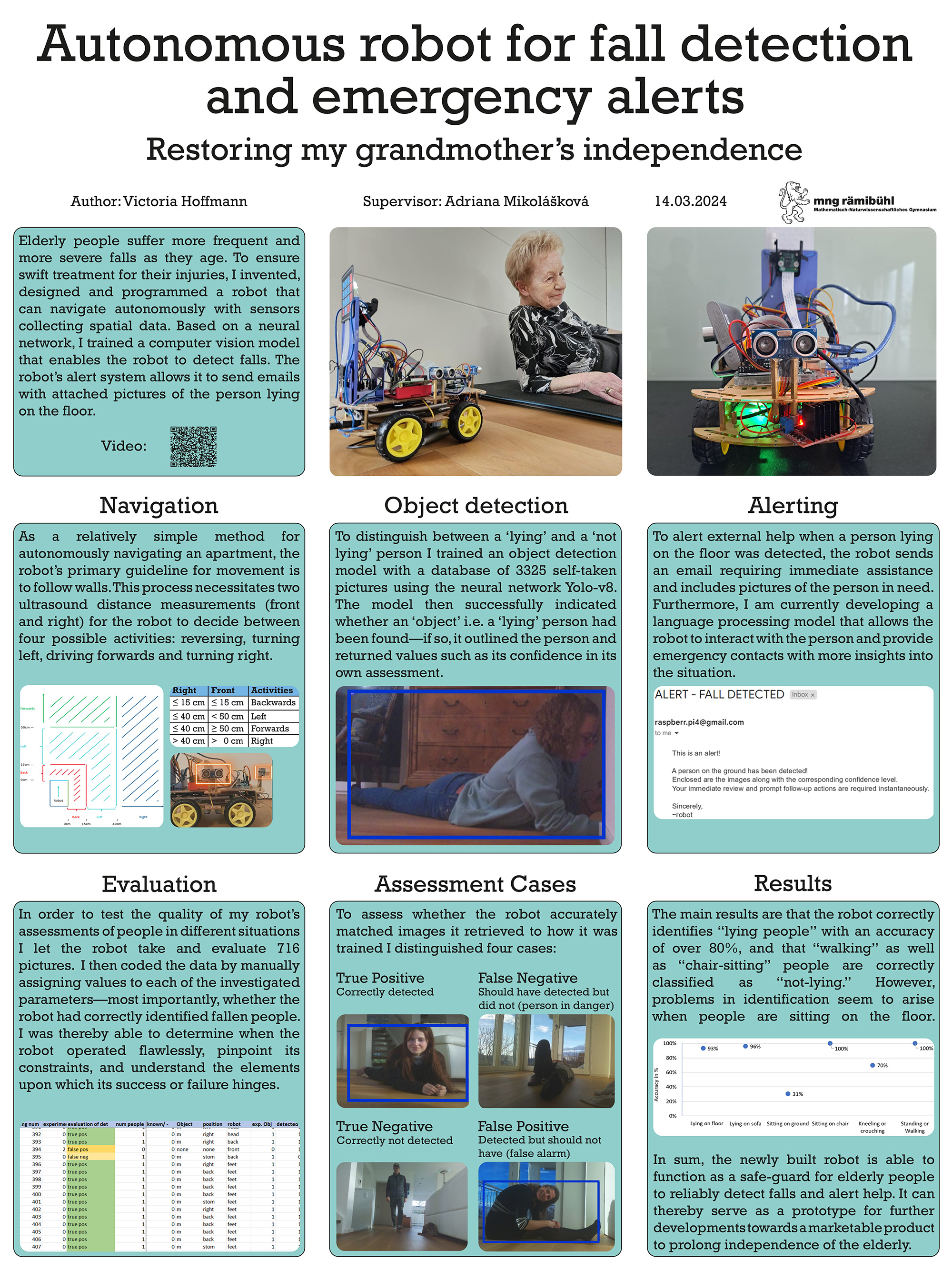 Elderly people suffer more frequent and more severe falls as they age. To ensure swift treatment for their injuries, I invented a robot that can navigate autonomously with sensors collecting spatial data. Based on a neural network, I trained a computer vision model that enables the robot to detect falls. The robot’s alert system allows it to send emails with attached pictures of the person lying on the floor. The main hardware components comprise a Raspberry Pi 4B+ (microprocessor), an Arduino Uno (microcontroller), a camera, four motors, two ultrasound sensors, and a keypad. The robot uses the “Bookworm” operating system and is mainly programmed in Python.