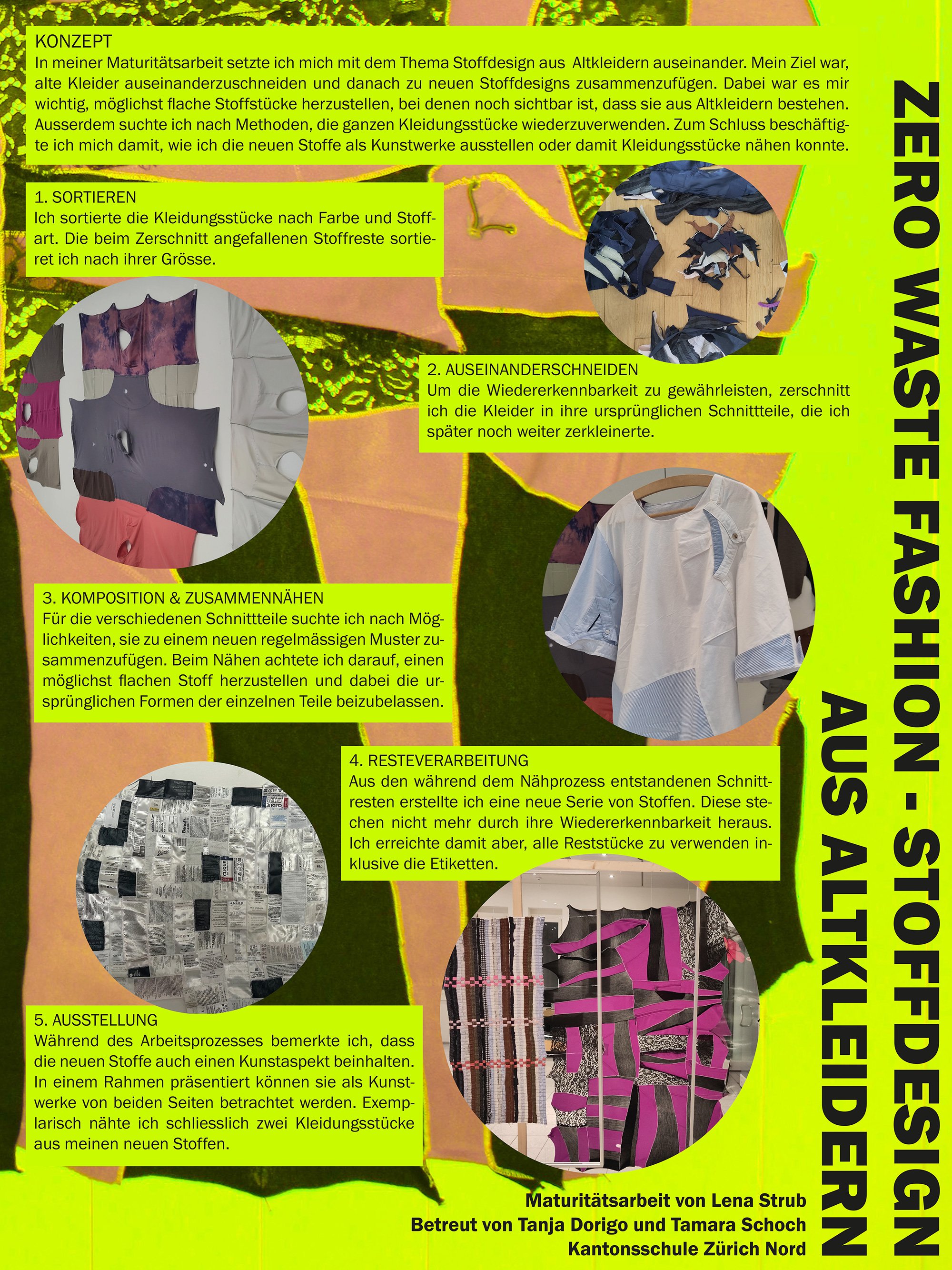 Das Ziel meiner Maturitätsarbeit war, aus Altkleidern neue Stoffdesigns herzustellen. Dazu habe ich Altkleider zerschnitten und neu zusammengenäht. Ich probierte, flache Stoffstücke zu designen, um daraus Kleidungsstücke zu nähen. Es war mir wichtig, dass im neuen Stoff sichtbar bleibt, dass er aus Altkleidern besteht.
