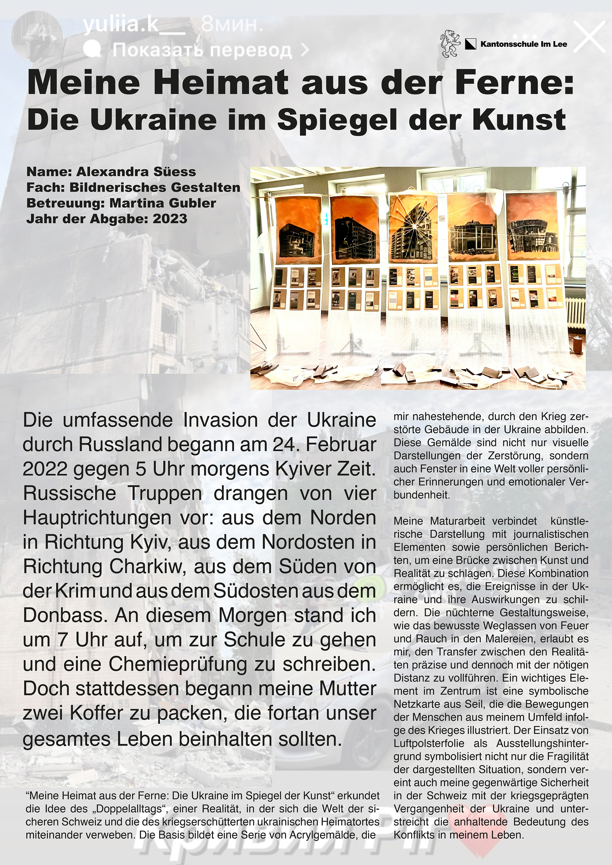 Inspiriert von der eindrücklichen Kontrastierung zweier Welten – der schützenden Schweiz und der vom Krieg gezeichneten Ukraine – widmet sich meine Maturarbeit der Darstellung des Krieges und seinen vielschichtigen Auswirkungen. Meine Maturarbeit zielt darauf ab, die Mehrdimensionalität der Kriegsauswirkungen künstlerisch zu erfassen. Durch die Kombination von Acrylgemälden, persönlichen Geschichten und journalistischen Elementen beleuchtet sie die physische Zerstörung und emotionale Tiefe der Kriegserfahrungen. Die Arbeit vereint Techniken des Expressionismus und Realismus, um komplexe Emotionen darzustellen, und stärkt durch die Integration aktueller Nachrichten mein Verständnis für soziale und historische Kontexte. Eine symbolische Netzkarte visualisiert die weitreichenden Folgen des Krieges und die Bewegungen der Menschen, während Luftpolsterfolie als Hintergrund die Zerbrechlichkeit der Situation unterstreicht. Die Maturarbeit bildet so eine Brücke zwischen Kunst und Realität, die es ermöglicht, ein tiefes Verständnis für die Ereignisse zu entwickeln. Sie ist ein persönliches Zeugnis der Zerstörung und des Verlusts, reflektiert die Zerbrechlichkeit des Lebens und zeigt die Kraft der Kunst, Emotionen und Geschichten zu vermitteln.
