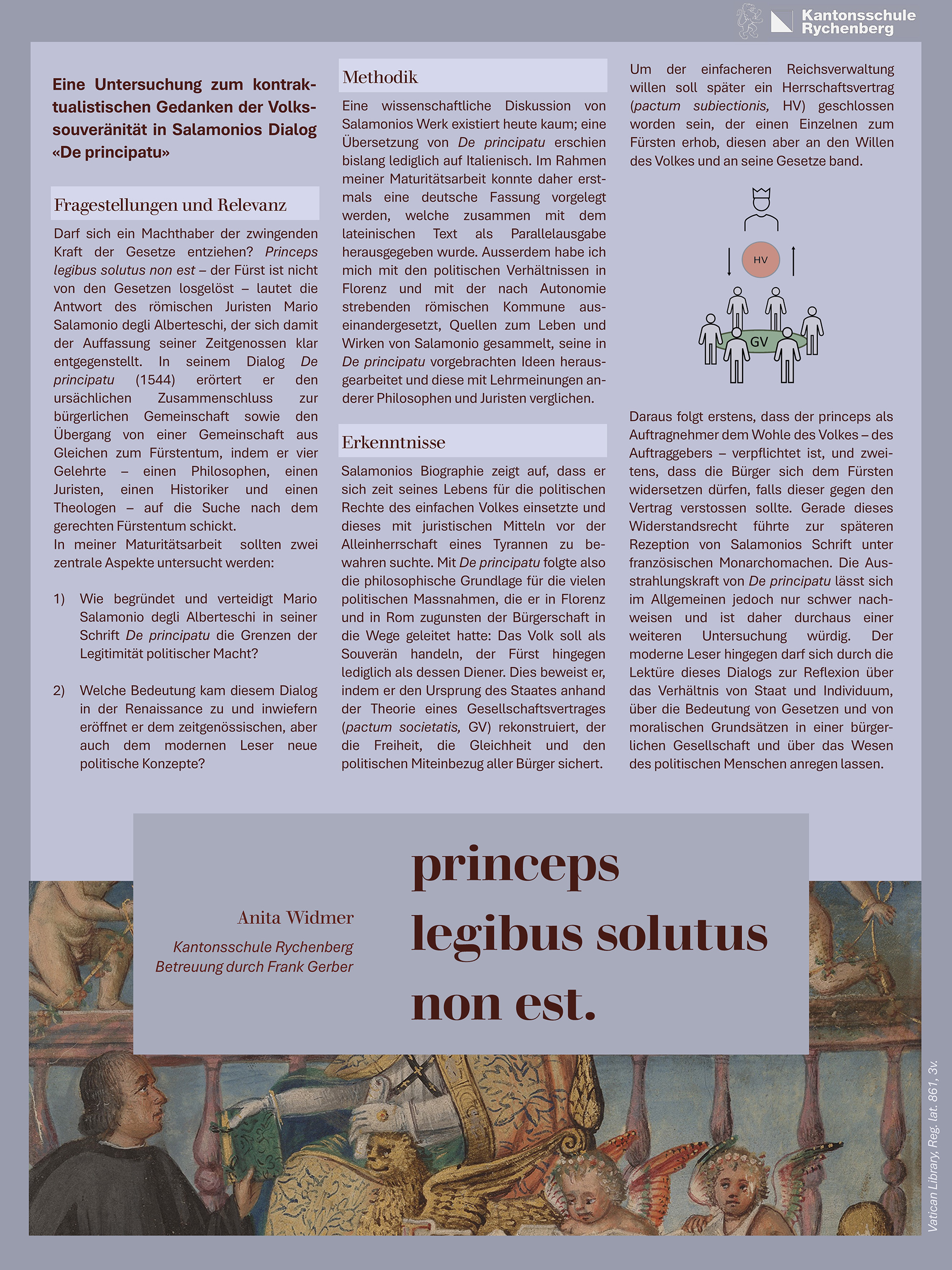 Darf sich ein Machthaber der zwingenden Kraft der Gesetze entziehen? Princeps legibus solutus non est, der Fürst ist nicht von den Gesetzen losgelöst, lautet die Antwort des römischen Juristen Mario Salamonio degli Alberteschi, der zu einer Zeit lebte, als sich freiheitliche Bürgerschaften Europas zunehmend durch unumschränkte Herrschaftsweisen bedroht sahen. In seiner Abhandlung De principatu (1544) zeigt Salamonio daher die Grenzen der Legitimität politischer Macht auf, indem er den anfänglichen Zusammenschluss zur bürgerlichen Gemeinschaft und die Ziele der Fürstenherrschaft in einem fruchtbaren Dialog zwischen vier Gelehrten – einem Philosophen, einem Juristen, einem Historiker und einem Theologen – erörtert. Seine staatspolitischen Überlegungen erweisen sich dabei noch immer als wegweisend, weshalb meine Maturitätsarbeit diese heute nahezu in Vergessenheit geratene Schrift in ihrer Argumentationsweise zu analysieren und historisch sowie ideengeschichtlich einzuordnen versucht. Insbesondere sollten die durch Salamonio zum ersten Mal formulierte Theorie des Gesellschaftsvertrages (pactum societatis) sowie seine differenzierte Auffassung der Volkssouveränität entwickelt werden, die den Kern seiner absolutismuskritischen Argumentation darstellen. Als Grundlage für meine Arbeit diente mir die eigenständig erarbeitete deutsche Erstübersetzung von De principatu, die ich zusammen mit dem lateinischen Text als Parallelausgabe drucken liess.