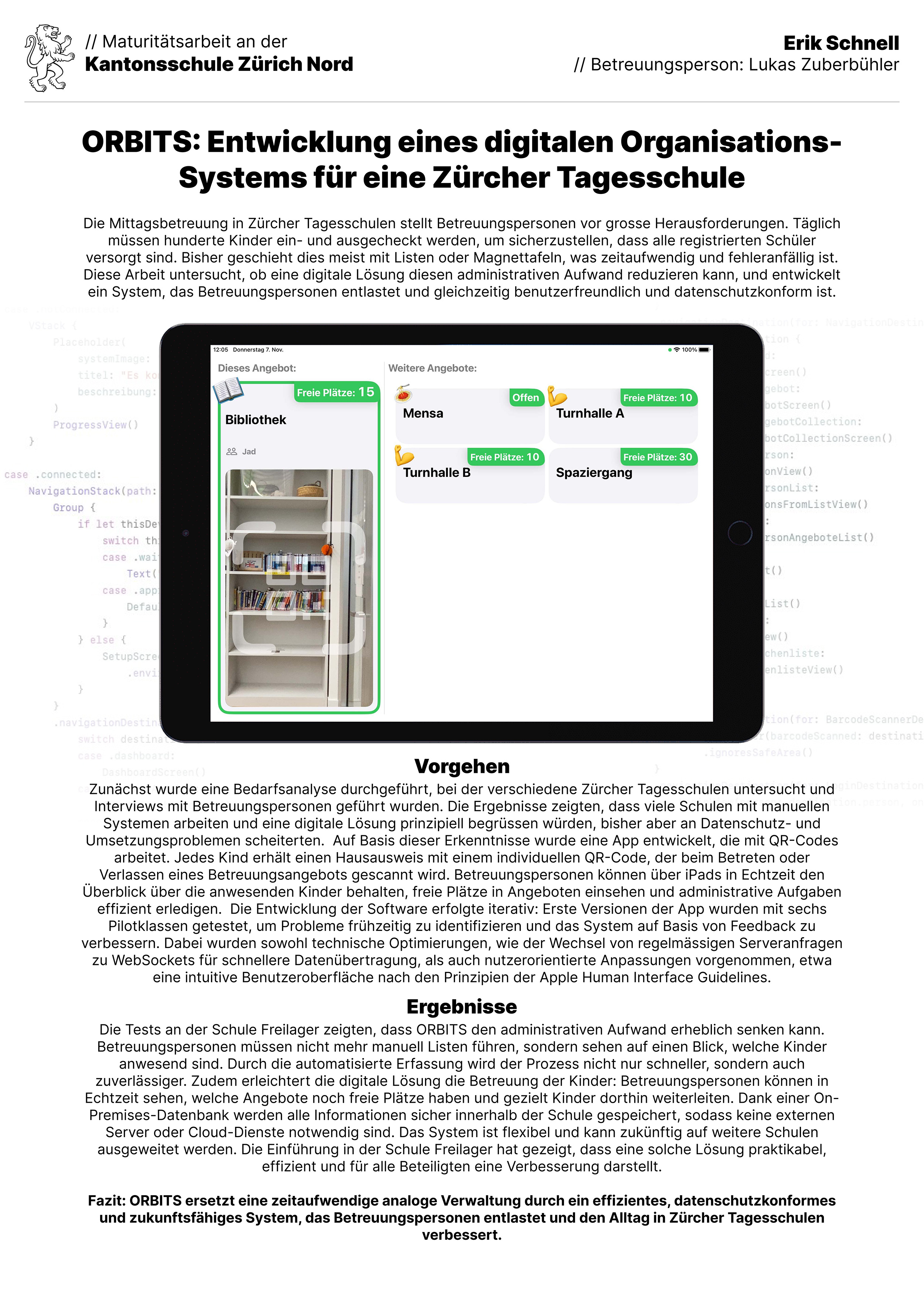 Diese Maturitätsarbeit befasst sich mit der Entwicklung einer digitalen Lösung zur Verwaltung der Mittagsbetreuung an einer Zürcher Tagesschule. Ziel war es, den administrativen Aufwand der Betreuungspersonen zu reduzieren. Hierfür wurde eine App entwickelt, die mithilfe von QR-Codes das Ein- und Auschecken der Kinder zu verschiedenen Angeboten ermöglicht. Bei der Auswahl der Hardware und der Entwicklung der Software lag ein besonderer Fokus auf dem Datenschutz. In enger Zusammenarbeit mit der Schule wurde die App über mehrere Wochen hinweg mit sechs Pilotklassen getestet. Die hier vorgeschlagene Lösung, die langfristig das bisherige manuelle System ablösen könnte, hat sich im Testzeitraum als vielversprechend erwiesen. Nach Weiterentwicklung des Systems ist es vorstellbar, dass es auch anderen Tagesschulen zugutekommen könnte. Dem System wurde der Name ORBITS gegeben: Organisation der Betreuung in Tagesschulen.