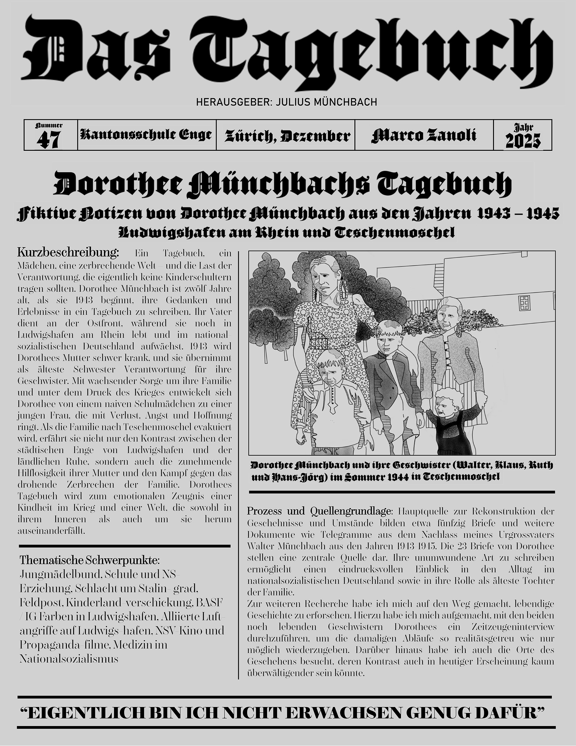 Die vorliegende Maturaarbeit ist das fiktive Tagebuch meiner 1930 geboren Grosstante Dorothee Münchbach über die Jahre 1943 bis 1945 und beleuchtet das Schicksal meiner Familie in Deutschland zum Ende des Dritten Reichs. Es schildert das Heranwachsen eines Mädchens unter den Bedingungen des Nationalsozialismus, der Kriegswirren und familiärer Not. Dorothee beschreibt in ihren Einträgen das Leben der Familie zwischen Ludwigshafen und dem Dorf Teschenmoschel, wohin die Familie evakuiert wurde, und den Verlauf der Krebserkrankung ihrer Mutter. Als älteste Tochter muss sie immer mehr Verantwortung für ihre vier kleinen Geschwister übernehmen und ihre Mutter pflegen. Grundlage der Arbeit bilden etwa 50 Briefe aus dem Nachlass meines Urgrossvaters aus dieser Zeit. Dazu kommen Zeitzeugenberichte, Ortsbesuche und ein Literaturstudium. Die verwendete Sprache versucht einerseits auf den Sprachgebrauch im Dritten Reich einzugehen und andererseits im Verlauf des Tagebuchs die persönliche Entwicklung Dorothees darzustellen. Es versteht sich nicht als historische Abhandlung, sondern vielmehr als Versuch, Ereignisse aus einer individuellen Perspektive aufzuarbeiten, wie auch auf die Empfindungen eines Mädchens einzugehen, dessen Kindheit durch Verlust und Verantwortung geprägt ist. Die Arbeit leistet damit auch einen persönlichen Beitrag zur Erinnerungskultur innerhalb der eigenen Familie.