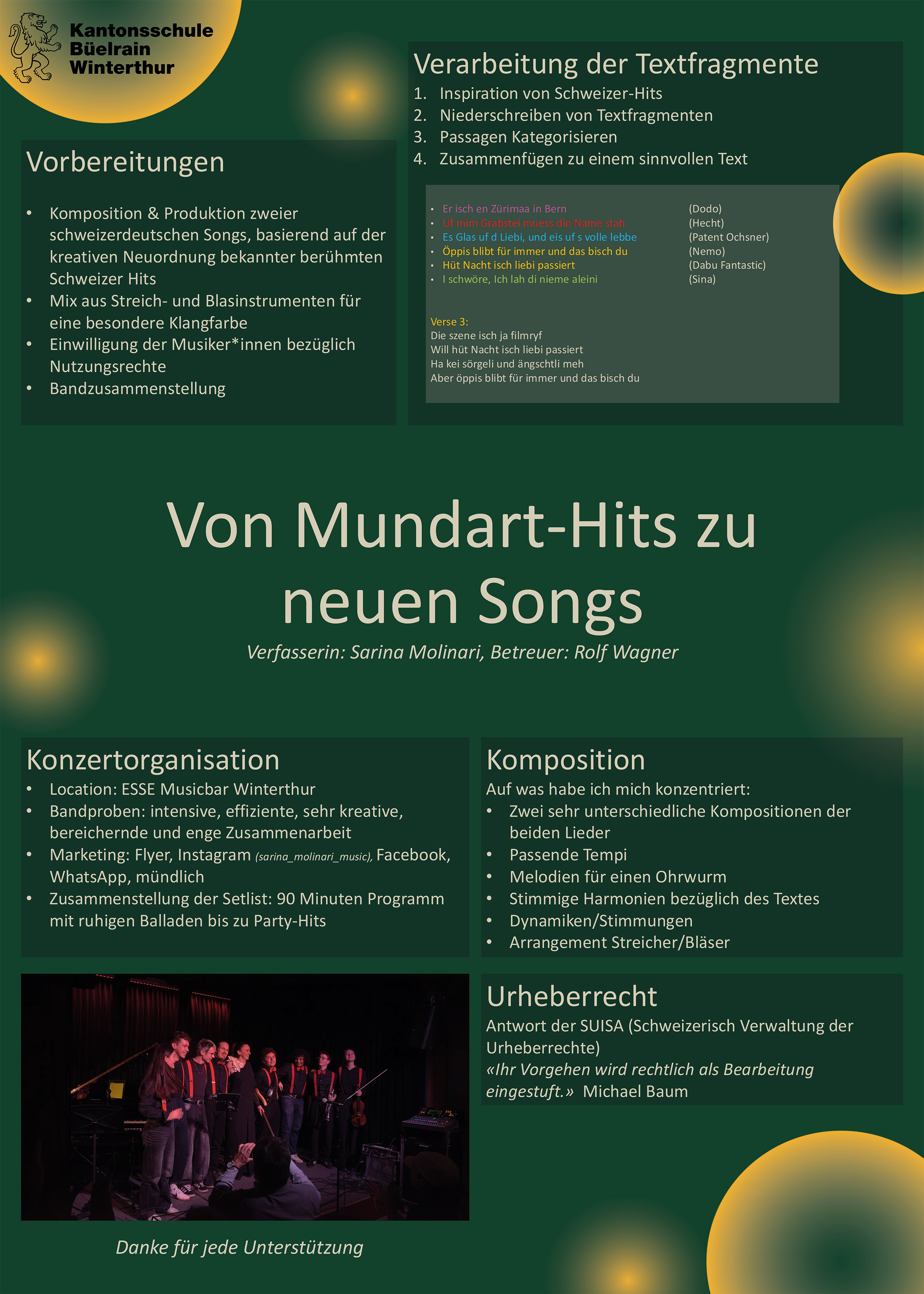 In meiner Maturaarbeit habe ich mich der Komposition und Produktion zweier schweizerdeutscher Songs gewidmet, basierend auf der kreativen Neuordnung bekannter Textpassagen berühmter Schweizer Lieder. Für mich als Sängerin, lag einerseits der Fokus auf dem Text: Wie können bekannte Textpassagen zu einer völlig neuen Geschichte zusammengesetzt werden? Durch die Umgestaltung erzähle ich eine unerwartete, aber vertraute Geschichte. Andererseits wollte ich die Band mit Bläsern und Streichern klanglich erweitern. Wie trägt diese Mischung aus Instrumenten wie Geige und Cello mit Trompete und Posaune zur Dynamik und Komplexität der Stücke bei? Im Rahmen der Arbeit wurden zudem das Thema Urheberrecht und die daraus entstehenden Herausforderungen behandelt, da ich mit bestehenden Texten arbeitete. Dazu führte ich ein Interview mit einem Juristen, dessen Erkenntnisse in den theoretischen Teil einflossen. Abschliessend stellte sich die Frage: Was gehört alles zur Organisation eines Konzerts, und wie kann man dieses zu einem besonderen Happening für das Publikum machen?