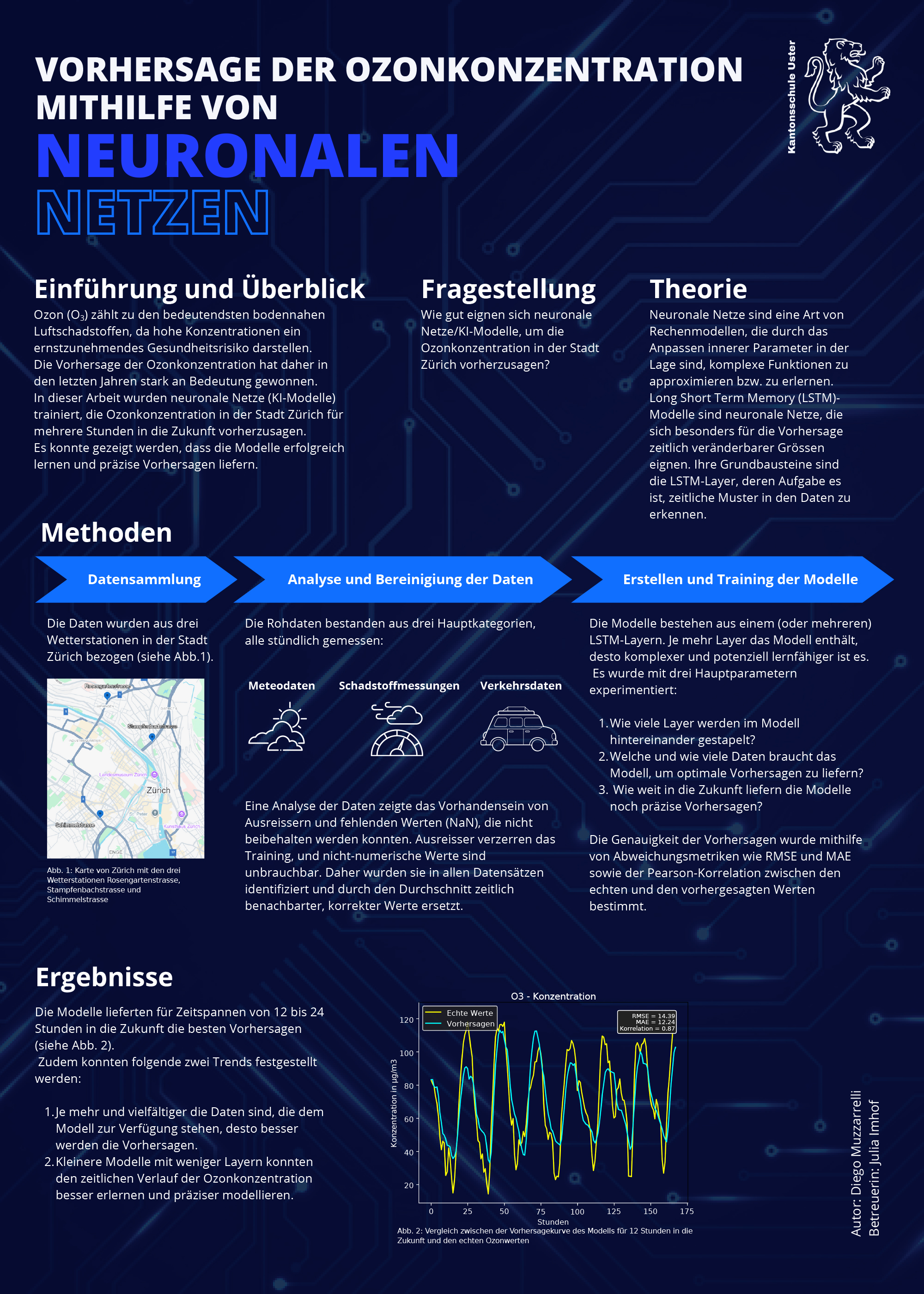 Ozon zählt zu den bedeutendsten bodennahen Luftschadstoffen, da hohe Konzentrationen ein ernstzunehmendes Gesundheitsrisiko darstellen. Die Vorhersage der Ozonkonzentration hat daher in den letzten Jahren stark an Bedeutung gewonnen. Traditionell basieren Prognosen auf Modellen, die chemische und physikalische Prozesse simulieren oder Trends in den Daten durch statistische Methoden identifizieren.