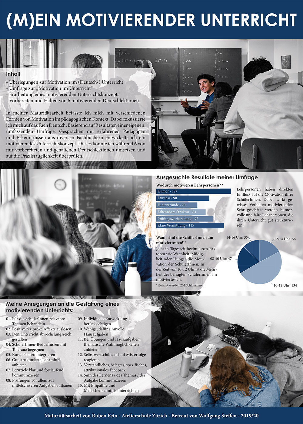 Im theoretischen Teil stellt der Autor einige relevante motivierende und demotivierende Aspekte eines Unterrichts dar. Grundsätzlich unterscheidet Ruben Fein zwischen strukturell-motivierenden Aspekten (z.B. Pausen) und psychologisch-motivierenden Aspekten (z.B. Rückmeldungen) eines Unterrichts. Um direkt an den Bedürfnissen der SchülerInnen anzuknüpfen, entwickelte der Autor einen Fragebogen, den insgesamt 202 SchülerInnen der Atelierschule Zürich beantworteten. Zusätzlich arbeitete Ruben Fein mit pädagogischen Fachbüchern und beriet sich mit erfahrenen PädagogInnen.