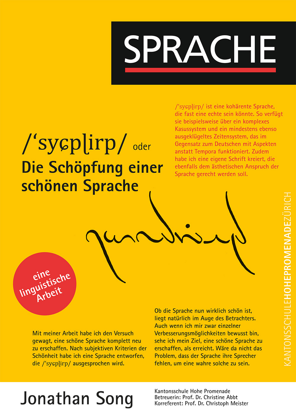 In seiner Arbeit wagt Jonathan Song den Versuch, eine schöne Sprache komplett neu zu erschaffen. Nach subjektiven Kriterien der Schönheit entwirft er eine Sprache, die /‘syɕpɭirp/ ausgesprochen wird. Dies tut er anhand diverser sprachwissenschaftlicher Studien und mit Hilfe einer Website namens ConWorkShop.