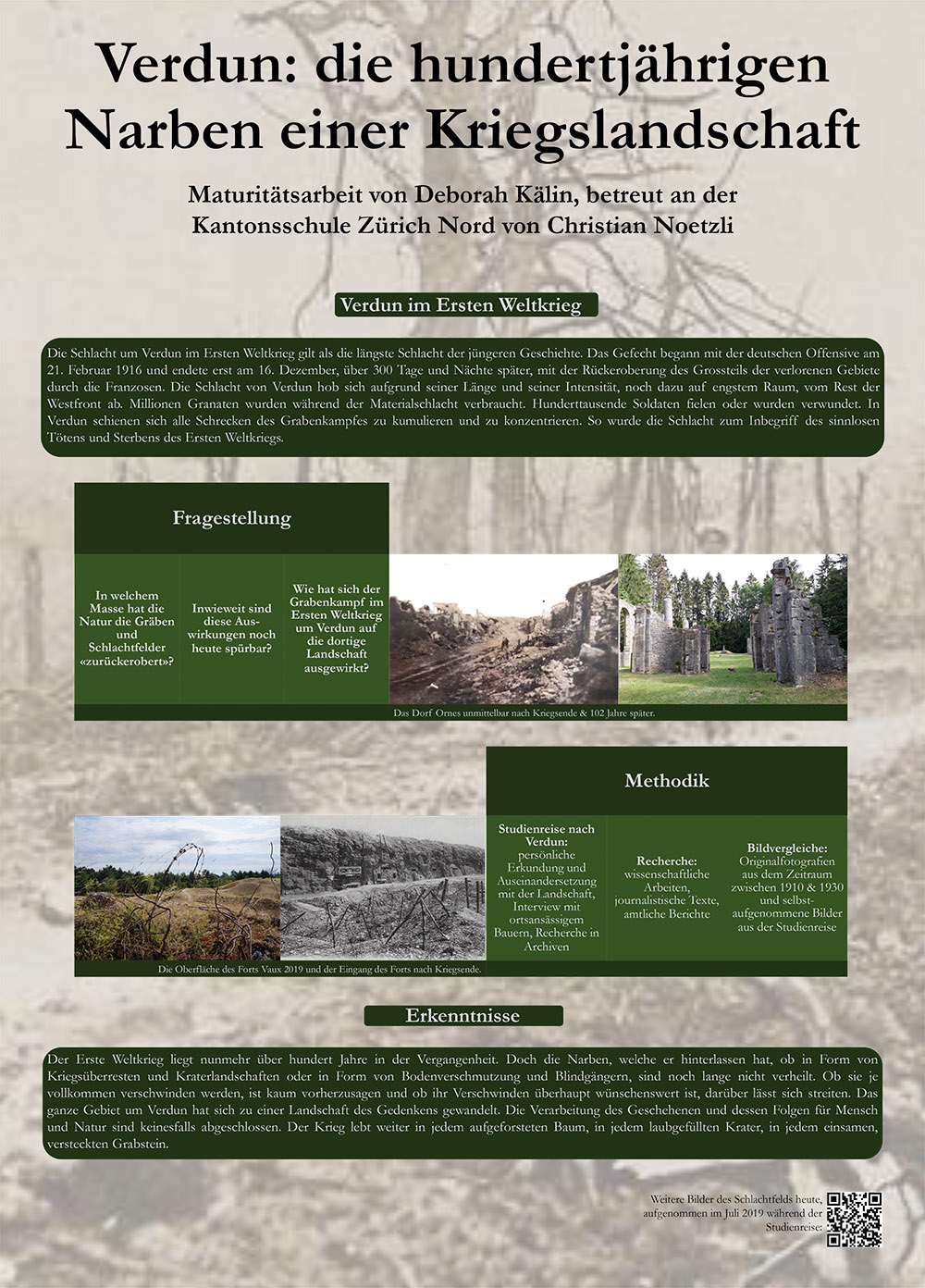 Eine Studienreise im Sommer 2019 diente als Grundlage für die Arbeit. Während der Studienreise besichtigte und untersuchte die Verfasserin das Schlachtfeld, recherchierte in den dortigen Archiven und führte ein Interview mit einem ortsansässigen Bauern. Um die Fragestellung zu ergründen, vergleicht die Arbeit anhand von Photographien die vorkriegszeitliche Landschaft mit der nachkriegszeitlichen. Sie verfolgt die Entwicklung der Region vom Niemandsland zu einem immensen Waldgebiet und zeigt die durch die Schlacht hervorgerufenen landschaftlichen Besonderheiten. Die langfristigen Konsequenzen der Schlacht werden durch aktuelle Problemstellungen der Forst- und Landwirtschaft in der Region illustriert, so zum Beispiel die Verschmutzung von Ackerböden durch Arsen und Schwermetalle, die Umforstung von Nadelholz-Monokulturen zu Laubmischwald sowie den Umgang mit Blindgängern.