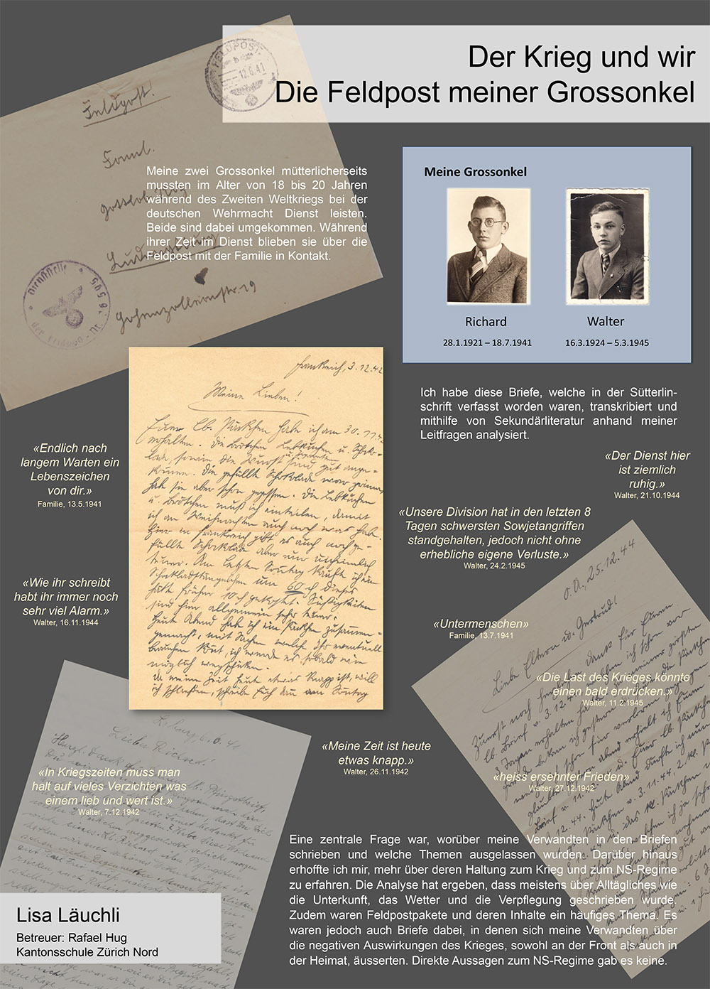 Die beiden Grossonkel mütterlicherseits von Lisa Läuchli mussten im Alter von 18–20 Jahren während des Zweiten Weltkriegs bei der deutschen Wehrmacht Dienst leisten. Beide sind dabei umgekommen. Während ihrer Zeit im Dienst blieben sie über die Feldpost mit der Familie in Kontakt. Der Urgrossmutter ist zu verdanken, dass fast 100 dieser Feldpostbriefe noch vorhanden sind. Darunter sind die Briefe der Eltern an ihre Söhne und umgekehrt. Die Verfasserin hat diese Briefe, welche in der Sütterlinschrift verfasst wurden, transkribiert und mithilfe von Sekundärliteratur anhand ihrer Leitfragen analysiert. Bei der Analyse galt es, den Einfluss von Zensur und Propaganda auf den Inhalt der Briefe zu beachten.