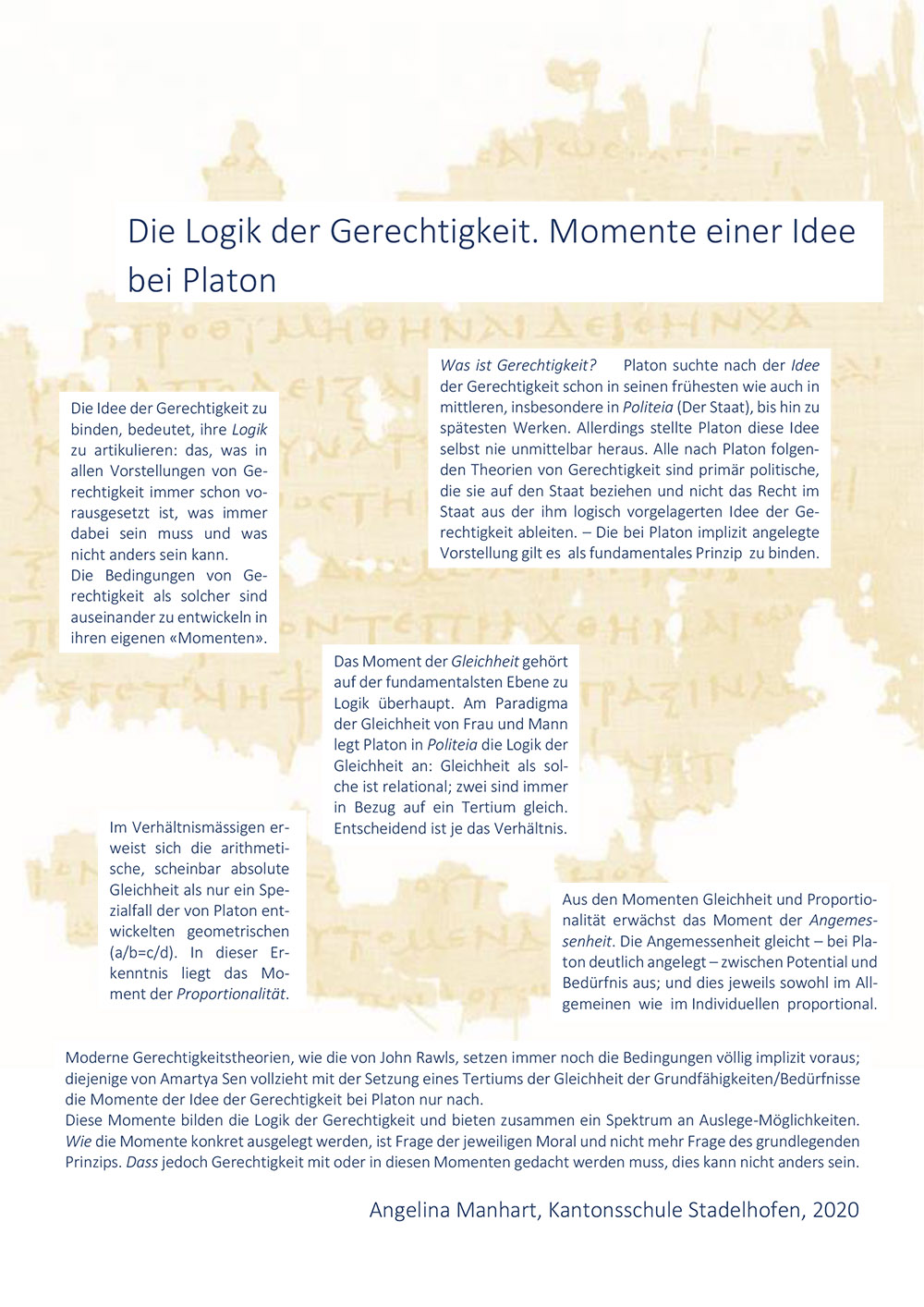 Gerechtigkeit ist ein fundamentales Prinzip, aus welchem Staat und Recht abgeleitet werden, nicht umgekehrt. Gerechtigkeit ist als Vorstellung immer schon vorausgesetzt, wenn Recht oder Unrecht gedacht werden. Genau diese Vorstellung gilt es explizit zu machen. Das Moment der Gleichheit gehört fundamental zur Logik überhaupt. Gleichheit ist immer schon da, wenn gedacht wird. Gleichheit ist zudem relational; sie wirkt als dreistelliger Operator, da zwei immer in Bezug auf ein Tertium gleich sind. Entscheidend ist das Verhältnis. So gilt die blosse arithmetische Gleichheit (allen das Gleiche) als Spezialfall der platonischen geometrischen Gleichheit (a/b=c/d). In dieser Erkenntnis liegt das Moment der Proportionalität. Aus diesen beiden Momenten erwächst das Moment der Angemessenheit. Die Angemessenheit gleicht zwischen Potential und Bedürfnis und darin zwischen Allgemeinem und Individuellem proportional aus, worin letztlich die Idee der Gerechtigkeit liegt. Diese Momente bieten zusammen ein Spektrum an Auslege-Möglichkeiten. Wie die Momente konkret ausgelegt werden, ist Frage der Moral und nicht mehr Frage des grundlegenden Prinzips. Dass Gerechtigkeit jedoch mit oder in diesen Momenten gedacht werden muss, dies kann nicht anders sein.