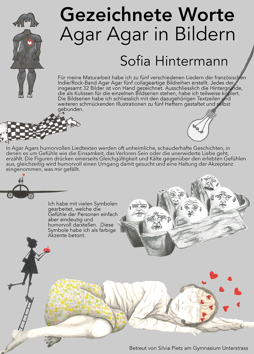 In meiner Maturarbeit habe ich mich hauptsächlich praktisch mit der Illustration, aber auch theoretisch mit verschiedenen Illustrationsstilen auseinandergesetzt. Im praktischen Teil meiner Arbeit habe ich fünf collageartige Bildreihen zu fünf verschiedenen Liedern der französischen Indie/Rock-Band Agar Agar erstellt.
