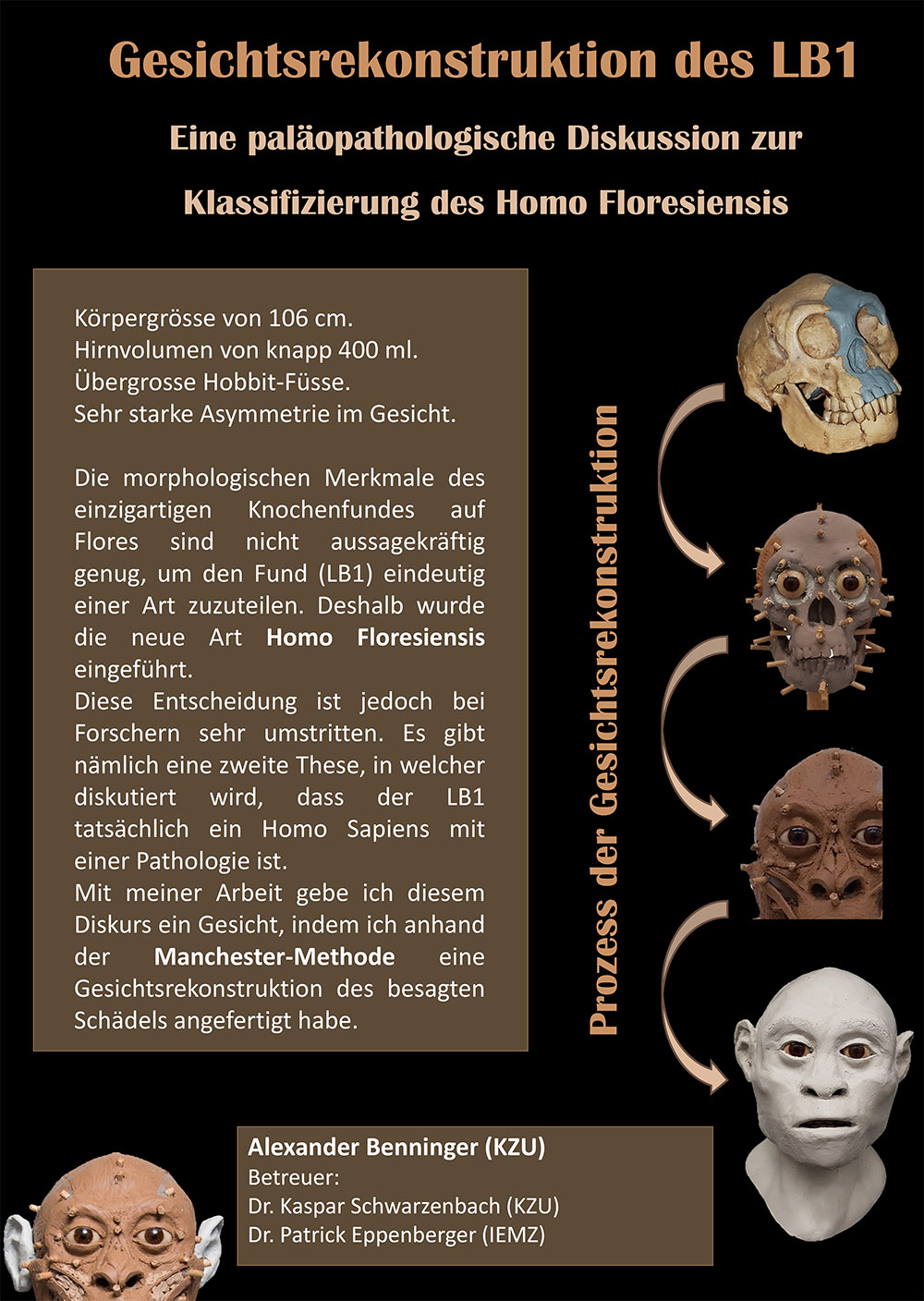 Im Rahmen seiner Maturitätsarbeit setzte sich Alexander Benninger mit dem historischen, paläoanthropologischen Fund des LB1 von 2003 auseinander. Er erstellte eine Gesichtsre­konstruktion des einzigartigen Schädels anhand der wissenschaftlich anerkannten Manchester-Methode der Gesichtsrekonstruktion. So wird ein Beitrag zur bestehenden Kontroverse über die Einberufung einer neuen Homo-Art, des Homo Floresiensis, basierend auf diesem Fund, geleistet. Die Entdeckung der 60`000 bis 100`000 Jahre alten Knochenreste in der Liang Bua Höhle (LB) auf der Insel Flores sorgten für einen Disput unter Paläo­anthropologen. Denn aufgrund seiner noch nie gesehenen morphologischen Merkmale konnten die Knochenfunde keiner bereits bekannten Homo- oder Australopithecus-Art zugewiesen werden. Dementsprechend folgte die Ernennung des Homo Floresiensis. Diese Entscheidung wird jedoch angefochten von Forschern, die diskutieren, dass es sich beim LB1 tatsächlich um einen Homo Sapiens mit einer Pathologie handelte.