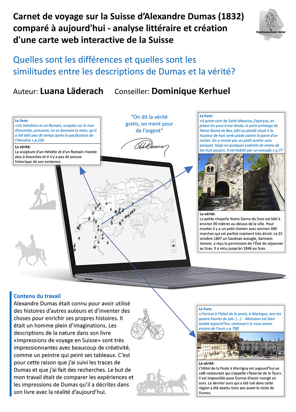 Das Ziel der vorliegenden Maturitätsarbeit war es, das in Französisch geschriebene Buch zu analysieren und die Beschreibungen mit der Realität von heute zu vergleichen. Wo sind Unterschiede und Ähnlichkeiten zu finden und wo hatte Dumas bei seinen Beschreibungen übertrieben oder sogar gelogen? Dieser Vergleich wurde vor Ort an den beschriebenen Plätzen gemacht und mit Fotos festgehalten. Einige Unterschiede und auch Gemeinsamkeiten zwischen Dumas’ Erzählungen und der Realität wurden auf einer interaktiven Webkarte veranschaulicht.