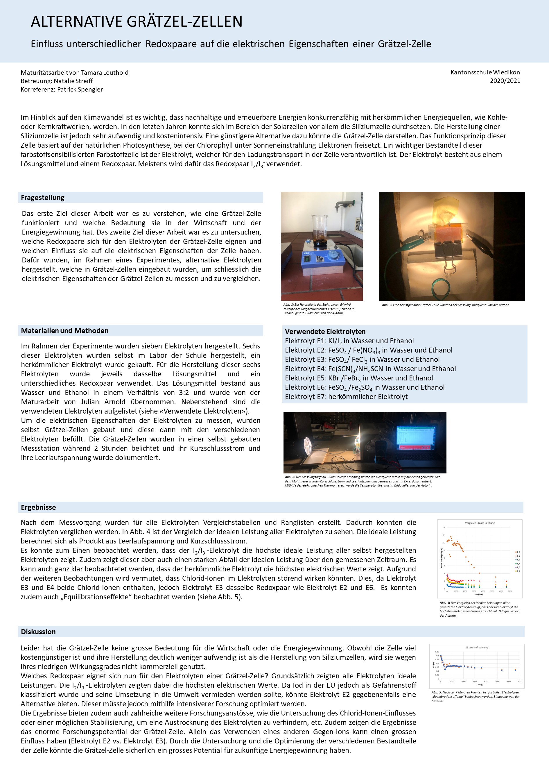 Das sich fortlaufend erwärmende Klima ist ein aktuelles Thema und beschäftigt uns alle. Erneuerbare Energien bieten dabei einen wichtigen Lösungsansatz. Die Arbeit Alternative Grätzel-Zellen beschäftigt sich mit einer sehr faszinierenden Solarzelle: der Grätzel-Zelle. Diese Zelle, welche nach ihrem Erfinder Michael Grätzel benannt wurde, basiert auf dem Prinzip der Photosynthese. Obwohl die Grätzel-Zelle einen vergleichsweise tiefen Wirkungsgrad besitzt, hat sie grosses Potenzial für die Solarenergie, denn ihre Herstellung ist deutlich günstiger und benötigt auch deutlich weniger Energie als die Herstellung von Siliziumzellen. Ein wichtiger Bestandteil dieser Zelle ist der Elektrolyt, welcher für den Ladungstransport innerhalb der Zelle verantwortlich ist. Herkömmlich enthalten solche Elektrolyten das Redoxpaar I2/I3-. Das Ziel der Arbeit war es, neben der Erarbeitung der Grundlagen den Einfluss unterschiedlicher Redoxpaare auf die elektrischen Eigenschaften von Grätzel-Zellen zu untersuchen. Dafür wurden unterschiedliche Elektrolyten hergestellt und in selbst gebaute Grätzel-Zellen eingebaut. Kurzschlussstrom und Leerlaufspannung der Grätzel-Zellen wurden auf einer ebenfalls selbst gebauten Messstation während zwei Stunden gemessen und ausgewertet. Es konnte aufgezeigt werden, dass das Redoxpaar I2/I3-, welches bereits herkömmlich verwendet wird, die grösste ideale Leistung erreichen konnte. Eine Alternative, welche relativ stabile Werte aufzeigte, war das Redoxpaar Fe2+/Fe3+. Die Ergebnisse schlagen ausserdem einen negativen Einfluss von Chlorid-Ionen auf die elektrischen Eigenschaften der Zelle vor.