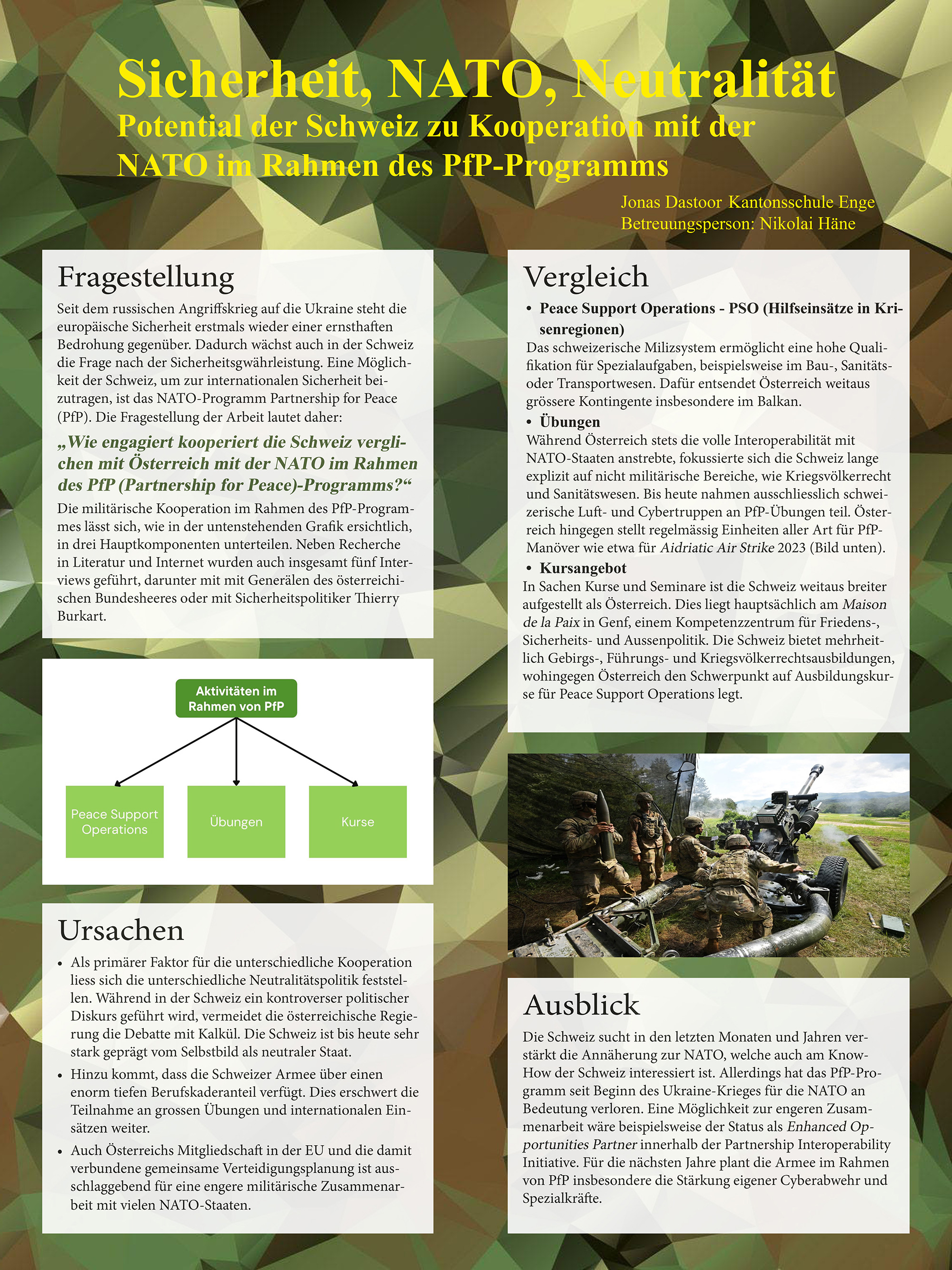 Seit dem russischen Angriffskrieg auf die Ukraine sieht sich Europa erstmals seit Ende des Zweiten Weltkrieges wieder einer ernsthaften Bedrohung gegenüber. Dies wirft auch für die neutrale Schweiz die Frage nach der Sicherheitsgewährleistung auf. Eine Antwort darauf ergibt sich durch die schweizerische Mitgliedschaft im NATO-Programm Partnership for Peace. Die Arbeit untersucht, wie viel ihres Potentials die Schweiz im Rahmen des PfP-Programms bereits nutzt. Als Vergleichsobjekt dient das ebenfalls neutrale Österreich.