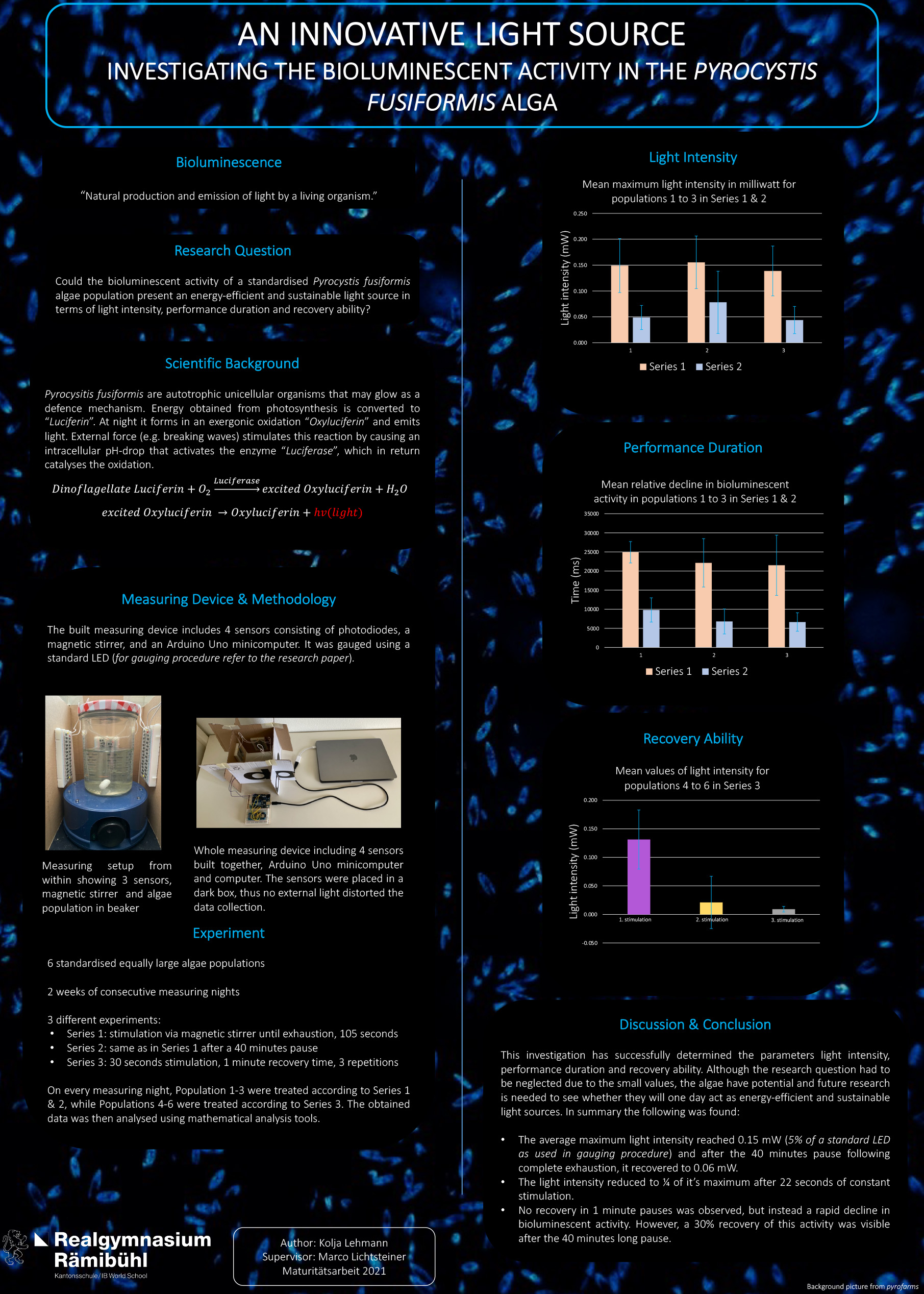 Mithilfe eines selbst konstruierten Messgerätes war ich in der Lage, die Lichtintensität, Leuchtdauer und Regenerationsfähigkeit der Pyrocystis fusiformis-Algen zu bestimmen.