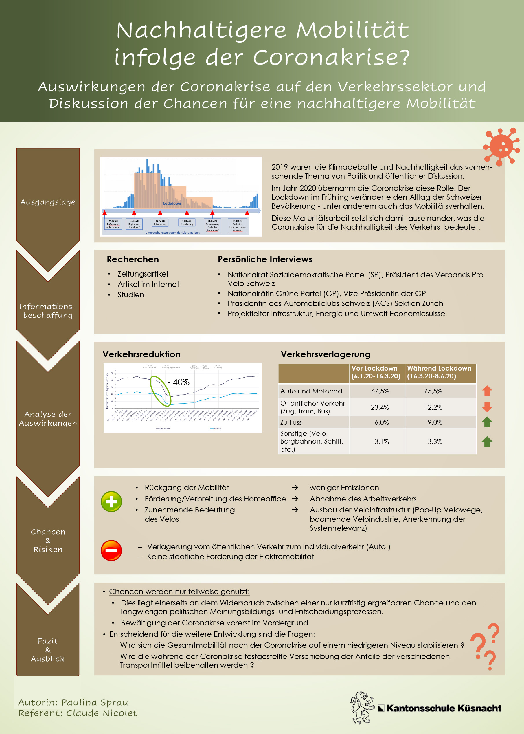 Ziel vorliegender Maturitätsarbeit ist es zu untersuchen, ob sich aus den Auswirkungen der Coronakrise auf den Verkehrssektor Chancen für eine nachhaltigere Mobilität ergeben, und zu beurteilen, ob diese auch genutzt werden. Als Informationsquellen dienten primär Internet- und Zeitungsrecherchen sowie vier persönlich durchgeführte Interviews mit Politikern und Stellvertretern verschiedener Interessenverbände. Die Auswirkungen der Coronakrise auf das Mobilitätsverhalten und die drei Bereiche Automobilsektor, Velosektor und öffentlicher Verkehr ergaben einen deutlichen Rückgang der Mobilität, was in erster Linie der Abnahme des Arbeitsverkehrs und der stark ausgeweiteten Nutzung des Homeoffice zugeschrieben werden kann. Neben der Verkehrsreduktion fand eine Verlagerung vom öffentlichen Verkehr zum Individualverkehr mit Auto und Velo statt. Der Velosektor profitierte von dieser verstärkten Nutzung z.B. durch das Entstehen einer neuer Veloinfrastruktur wie Pop-up-Velowegen. Bei der Untersuchung möglicher Chancen und/oder Risiken, die sich aus diesen Veränderungen ergeben, wurde ersichtlich, dass der Rückgang der Mobilität, die Auswirkungen im Bereich des Velosektors sowie die Arbeit im Homeoffice einen Beitrag zur nachhaltigeren Mobilität leisten können. Diese Entwicklungen stellen Chancen dar. Allerdings besteht die Wahrscheinlichkeit, dass die prozentuale Nutzung der Verkehrsmittel während des Lockdowns (mehr Auto, weniger ÖV) weiterhin bestehen bleiben wird, sei es aus Gewohnheit oder aus weiterer Angst vor einer Ansteckung mit dem Virus im ÖV. Dies stellt ein Risiko für die Nachhaltigkeit dar, insbesondere da die gesamte Mobilität voraussichtlich wieder ansteigen wird. Die Arbeit zeigte schliesslich auf, dass Chancen nur teilweise genutzt werden. Dies liegt einerseits an dem Widerspruch zwischen einer nur kurzfristig ergreifbaren Chance und den langwierigen politischen Meinungsbildungs- und Entscheidungsprozessen. Andererseits standen die Massnahmen zur Bewältigung der Coronakrise vorerst im Vordergrund.