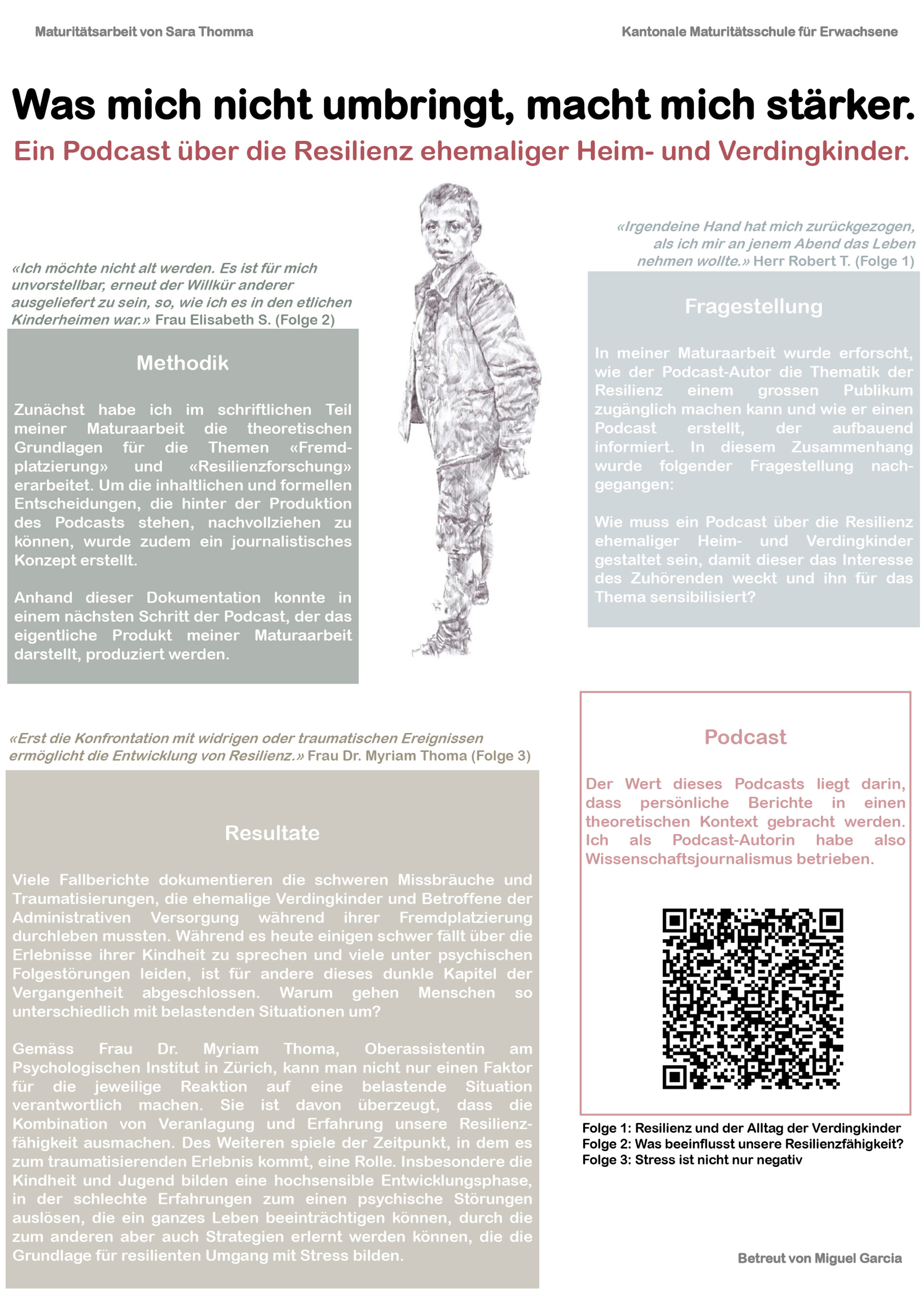 Die vorliegende Arbeit bietet dem Leser einen Einblick in die Planung und Ausführung eines Podcasts über die Resilienz ehemaliger Heim- und Verdingkinder. Das eigentliche Produkt der Maturitätsarbeit ist der Podcast, wobei der schriftliche Teil lediglich der theoretischen Untermauerung dient. In den ersten Kapiteln wird kurz auf die Geschichte der Fremdplatzierung eingegangen, um dann in einem zweiten Teil die Thematik der Resilienz als psychische Widerstandskraft am Beispiel von Betroffenen der Verdingung und der administrativen Versorgung aufzunehmen. Dabei werden insbesondere aktuelle Studien des psychologischen Instituts der Universität Zürich mit einbezogen. Fokus der Arbeit liegt auf dem dritten und zugleich letzten Teil, in dem ein journalistisches Konzept erstellt wird, um die Gestaltung des Podcast fundiert begründen zu können. Der Podcast ist in drei Folgen gegliedert, in denen der Frage nachgegangen wird, warum gewisse Menschen resilienter sind als andere. Der Hörer wird dabei über die besondere Kraft der Psyche, Belastungen auszuhalten, aufgeklärt. Das Fachwissen von Dr. Myriam Thoma hilft ihm, die Erzählungen Betroffener der Fremdplatzierung zu verstehen und den eigenen Schutzmechanismus vor psychischen Belastungen zu hinterfragen.