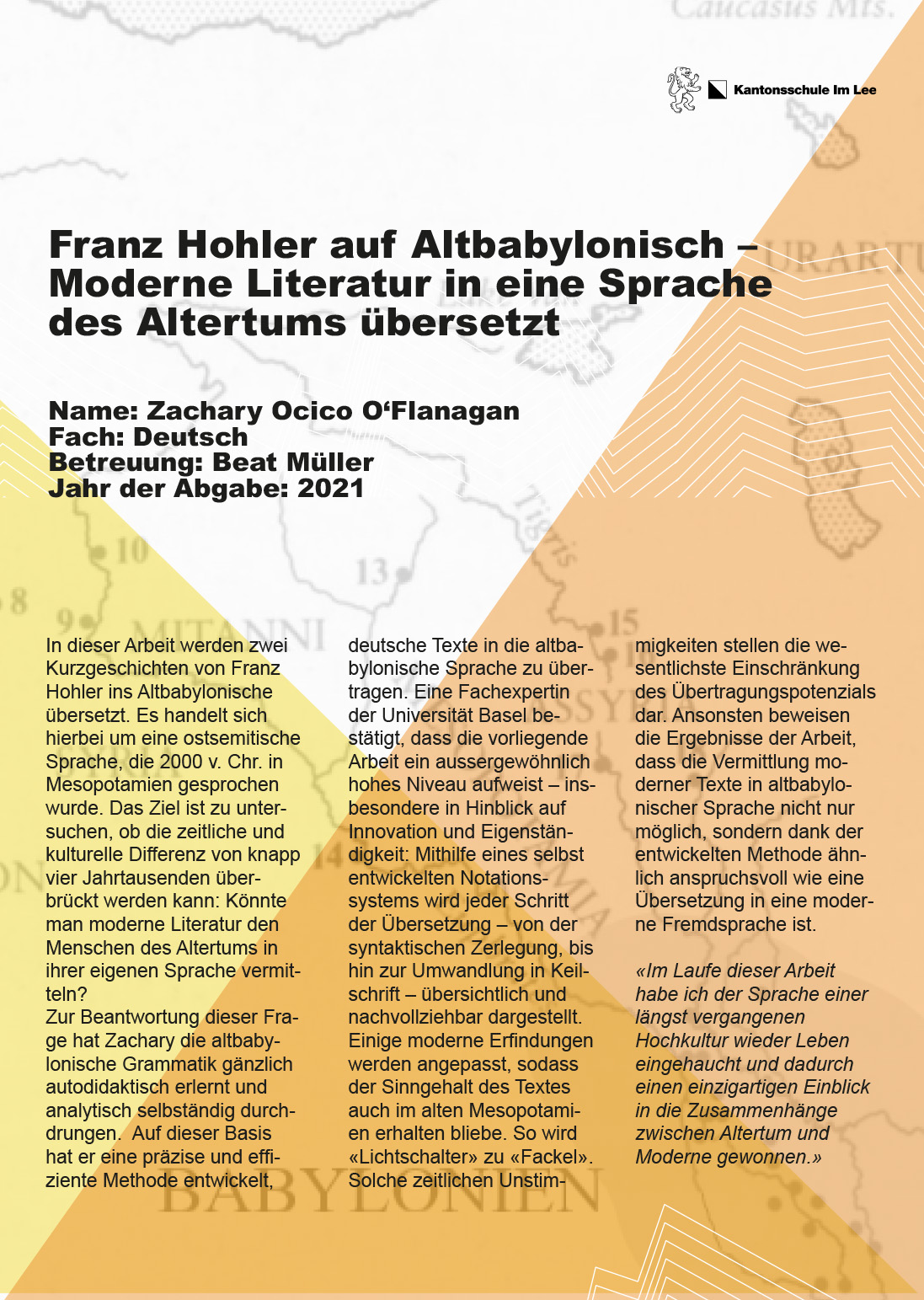 In dieser Maturaarbeit werden zwei Kurzgeschichten von Franz Hohler ins Altbabylonische übersetzt. Es handelt sich hierbei um eine ostsemitische Sprache, die 2000 v. Chr. in Mesopotamien gesprochen wurde. Das Ziel ist zu untersuchen, ob die zeitliche und kulturelle Differenz von knapp vier Jahrtausenden überbrückt werden kann: Kann man moderne Literatur den Menschen des Altertums in ihrer eigenen Sprache vermitteln? Zur Beantwortung dieser Frage hat Zachary Ocico O'Flanagan die altbabylonische Grammatik gänzlich autodidaktisch erlernt und analytisch selbständig durchdrungen. Auf dieser Basis hat er eine präzise und effiziente Methode entwickelt, deutsche Texte in die altbabylonische Sprache zu übertragen. Eine Fachexpertin der Universität Basel bestätigt, dass die vorliegende Arbeit ein aussergewöhnlich hohes Niveau aufweist – insbesondere in Hinblick auf Innovation und Eigenständigkeit: Mithilfe eines selbst entwickelten Notationssystems wird jeder Schritt der Übersetzung – von der syntaktischen Zerlegung, bis hin zur Umwandlung in Keilschrift – übersichtlich und nachvollziehbar dargestellt. Einige moderne Erfindungen werden angepasst, damit der Sinngehalt des Textes auch im alten Mesopotamien erhalten bleibt. So wird Lichtschalter zu Fackel. Solche zeitlichen Unstimmigkeiten stellen die wesentlichste Einschränkung des Übertragungspotenzials dar. Ansonsten beweisen die Ergebnisse der Arbeit, dass die Vermittlung moderner Texte in altbabylonischer Sprache nicht nur möglich, sondern dank der entwickelten Methode ähnlich anspruchsvoll wie eine Übersetzung in eine moderne Fremdsprache ist.