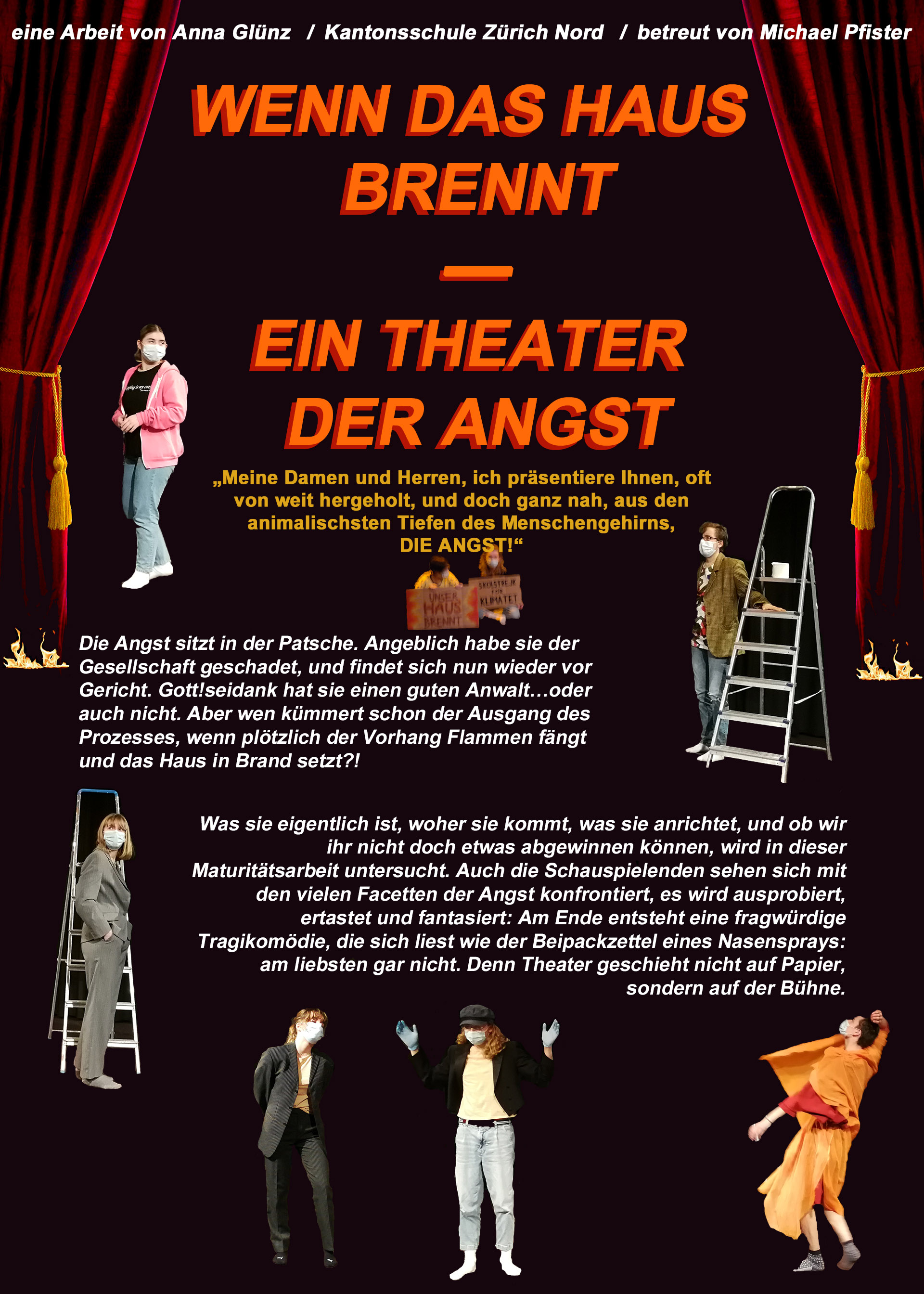 Meine Damen und Herren, ich präsentiere Ihnen, oft von weit hergeholt und doch ganz nah, aus den animalischsten Tiefen des Menschengehirns, DIE ANGST! Mit diesen Worten beginnt die Staatsanwältin ihre Rede. Wir befinden uns inmitten eines Strafprozesses gegen die Angst, die ihrer mutmasslich gesellschaftsschädigenden Funktion wegen auf der Anklagebank sitzt. Was sie eigentlich ist und woher sie kommt, was sie anrichtet und ob wir ihr nicht doch etwas abgewinnen können: Das soll im Prozess geklärt werden. Im Rahmen der Maturitätsarbeit habe ich eigens ein Theaterstück konzipiert und mithilfe sieben wunderbarer Schauspieler*innen auf die Bühne gebracht. Um der Angst auf den Grund zu gehen, wurden umfangreiche Recherchen in den Bereichen Soziologie, Politik und Philosophie angestellt und folgende drei Leitfragen ausformuliert: 1. Braucht man die Angst in unserer Gesellschaft noch oder ist sie ein hinderliches, ja sogar gefährliches Relikt aus längst vergangener Zeit? 2. Wie kann man diese wissenschaftlichen Erkenntnisse in ein Theaterstück einbauen? 3. Wie erarbeitet man sich eine eigene Theaterproduktion? Wenn das Haus brennt – ein Theater der Angst ist ein klamaukiges Patchwork aus Szenen und Theorien, ein lauter Angstschrei, der hoffentlich nicht ganz von der Mund- und Nasenbedeckung verschluckt wurde, und vor allem aber eine Arbeit, auf die ich stolz bin. Viel neues Wissen wurde gewonnen, wertvolle Erfahrungen wurden gemacht. Theater wurde gespielt und wird auch in Zukunft gespielt werden.
