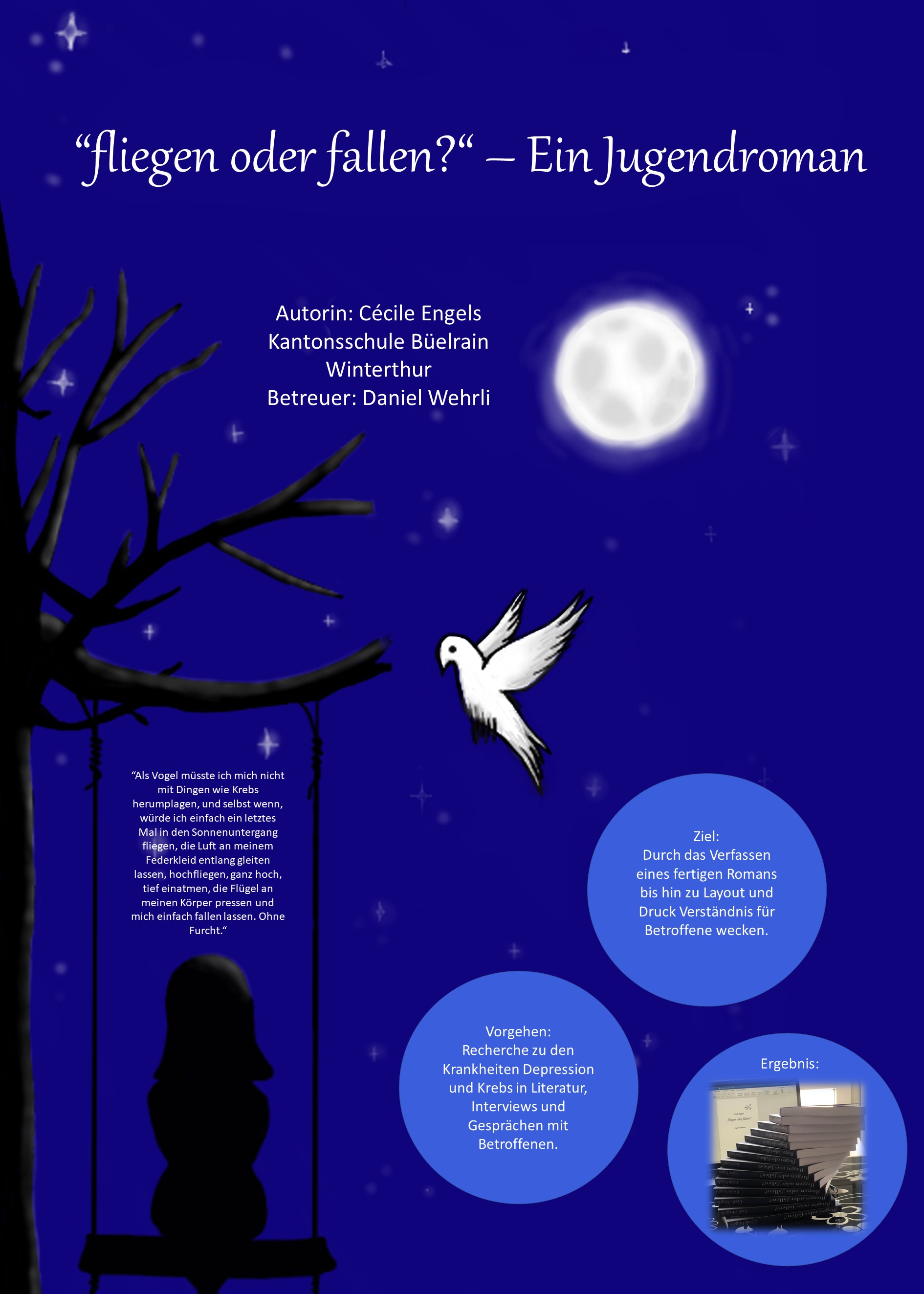 In dem von Cécile Engels verfassten Jugendroman fliegen oder fallen? findet die von einer depressiven Phase gequälte Malu in der an Nierenkrebs erkrankten Clara eine Freundin. Die beiden knapp 15-jährigen Mädchen fühlen sich mit ihren jeweiligen Krankheiten allein gelassen. Erst zusammen schaffen sie es, durch tiefe Gespräche und die Auseinandersetzung mit ihren Ängsten, Malu den Weg aus ihrer eigenen Dunkelheit zu zeigen und Clara die Angst vor dem möglichen Tod zu nehmen. Der Roman ist auf der Basis von Gesprächen mit betroffenen Jugendlichen, Interviews mit Ärztinnen und Fachliteratur entstanden. Die Kapitel sind abwechselnd aus Malus und aus Claras Perspektive geschrieben, wodurch ein genauer Einblick in deren Gefühls- und Gedankenwelt gewährleistet ist. Das Buch erstreckt sich über 175 Seiten, ist geprägt von subtiler Spannung und findet ein unsentimentales, verhalten optimistisches Ende. Im Werkbericht geht Cécile Engels auf die Interpretation einiger Stellen und Charaktere des Buches ein sowie auf den Entstehungsprozess und verschiedene literarische Aspekte. Der Roman ist vor allem für Jugendliche geschrieben, die mit Problemen zu kämpfen haben, und in der Hoffnung entstanden, ihnen neue Blickwinkel aufzuzeigen oder zumindest das Gefühl von Verständnis zu vermitteln. Aber auch für Erwachsene bietet das Werk ein prägendes Leseerlebnis und kann zu grösserer Anteilnahme für Betroffene führen.