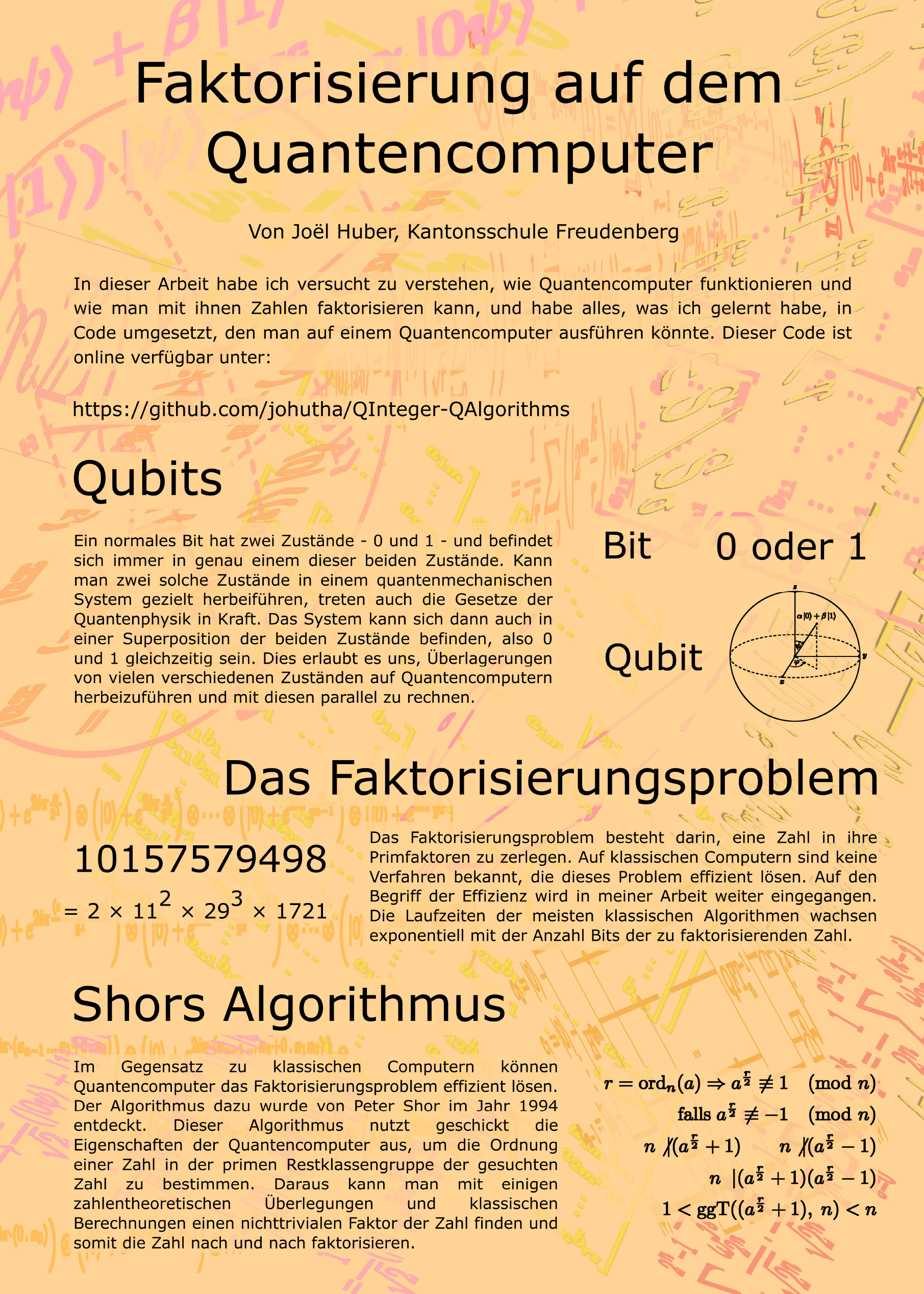 In meiner Maturitätsarbeit habe ich mich mit Quantencomputern und ihrer Anwendung für das Faktorisierungsproblem auseinandergesetzt. Dazu habe ich mich in einem ersten Schritt mit dem mathematischen Konzept der Qubits befasst. Danach habe ich mich mit den arithmetischen Operationen und deren Umsetzung auf Quantenzahlen und anschliessend mit dem Konzept der Phasenabschätzung beschäftigt. Mit Hilfe dieser Grundlagen habe ich den Shor-Algorithmus genauer betrachtet, mit welchem man einen nichttrivialen Teiler einer Zahl finden kann, um sie so nach und nach zu faktorisieren. Ziel dieses Projekts war es zu verstehen, wie Quantencomputer funktionieren, und eine Arbeit zu schreiben, die zusammen mit geeigneter Fachliteratur den Einstieg in dieses Gebiet vereinfachen kann. Auf der anderen Seite war es auch das Ziel, das Gelernte in Code umzusetzen. So habe ich zwei Programmbibliotheken in der Quantenprogrammiersprache Q# geschrieben, mit welchen man arithmetische Operationen auf Quantenzahlen ausführen kann, und den Shor-Algorithmus und alle dazu benötigten Algorithmen vollständig implementiert. Diesen Programmcode könnte man auf einem Quantencomputer ausführen. Er ist auch online verfügbar unter: https://github.com/johutha/QInteger-QAlgorithms