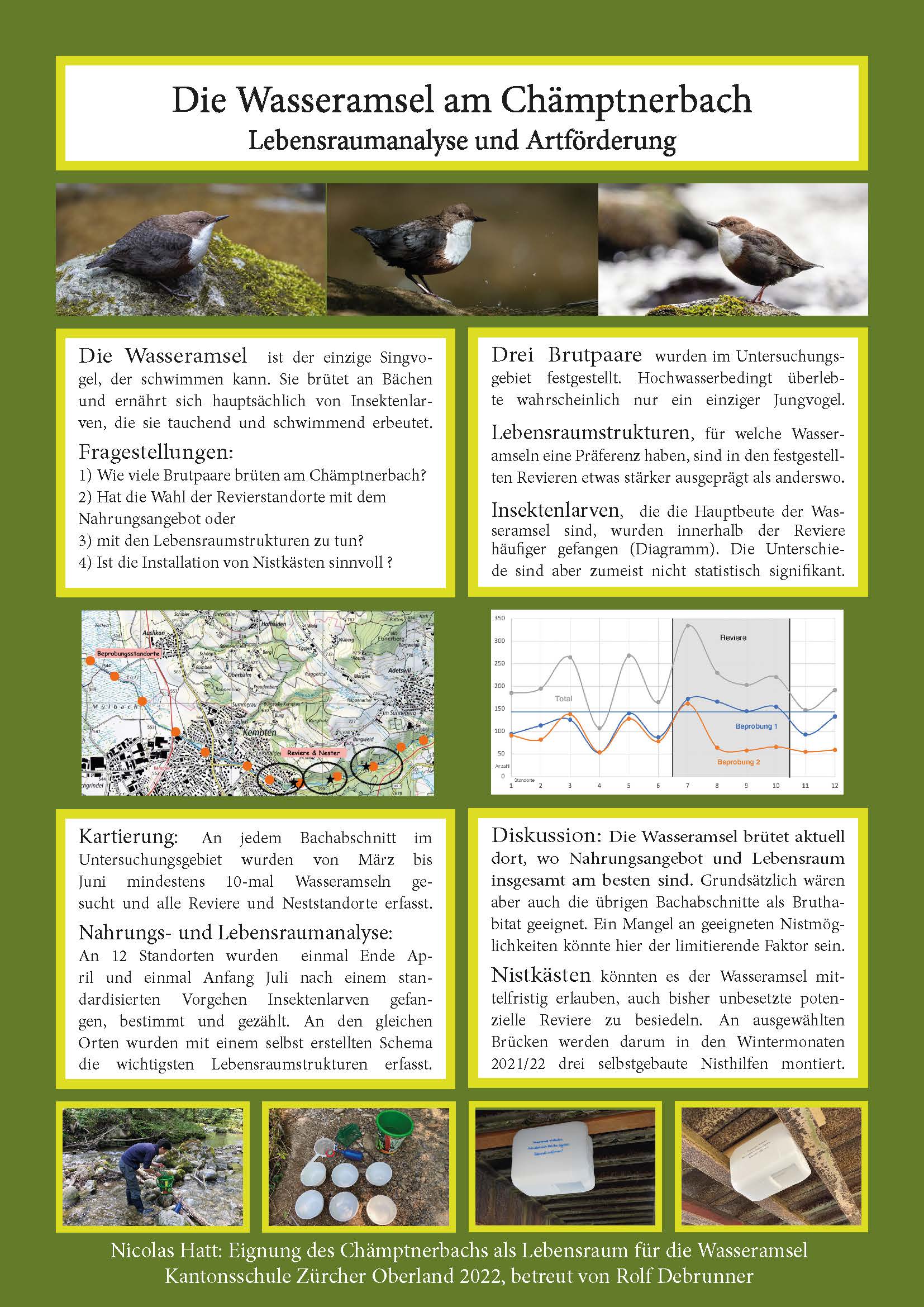 Vom März bis Juni 2021 wurden die Brutbestände der Wasseramsel (Cinclus cinclus) an den unteren fünf Kilometern Bachlauf des Chämptnerbachs im Zürcher Oberland kartiert. Parallel dazu wurden an zwölf regelmässig verteilten Standorten durch Kicksampling das Nahrungsangebot (primär wasserlebende Insektenlarven) und mittels eines eigens erarbeiteten Beurteilungsschemas die ökologischen Bachstrukturen erfasst. Es wurden drei Brutreviere mit einer Länge von je nicht ganz 500 m gefunden, der Bruterfolg war aufgrund von zwei Hochwassern tief, nur ein einziger ausgeflogener Jungvogel konnte festgestellt werden. Werden Nahrungsangebot, Lebensraumqualität und Verfügbarkeit potenzieller Nistplätze zusammengenommen, sind die Brutreviere für die Wasseramsel tatsächlich attraktiver als andere Bachabschnitte. Grundsätzlich eignet sich jedoch auch der übrige Chämptnerbach als Habitat. Das fast völlige Fehlen attraktiver Nistplätze könnte hier durch die Installation von Nistkästen kompensiert und, so die Hoffnung, die Brutbestände der Wasseramsel langfristig erhöht werden. Ein entsprechendes Projekt wird im Ausblick skizziert. Kartierung und Aufgleisung dieses Projekts geschahen teils in Zusammenarbeit mit dem Naturschutzverein Wetzikon-Seegräben.