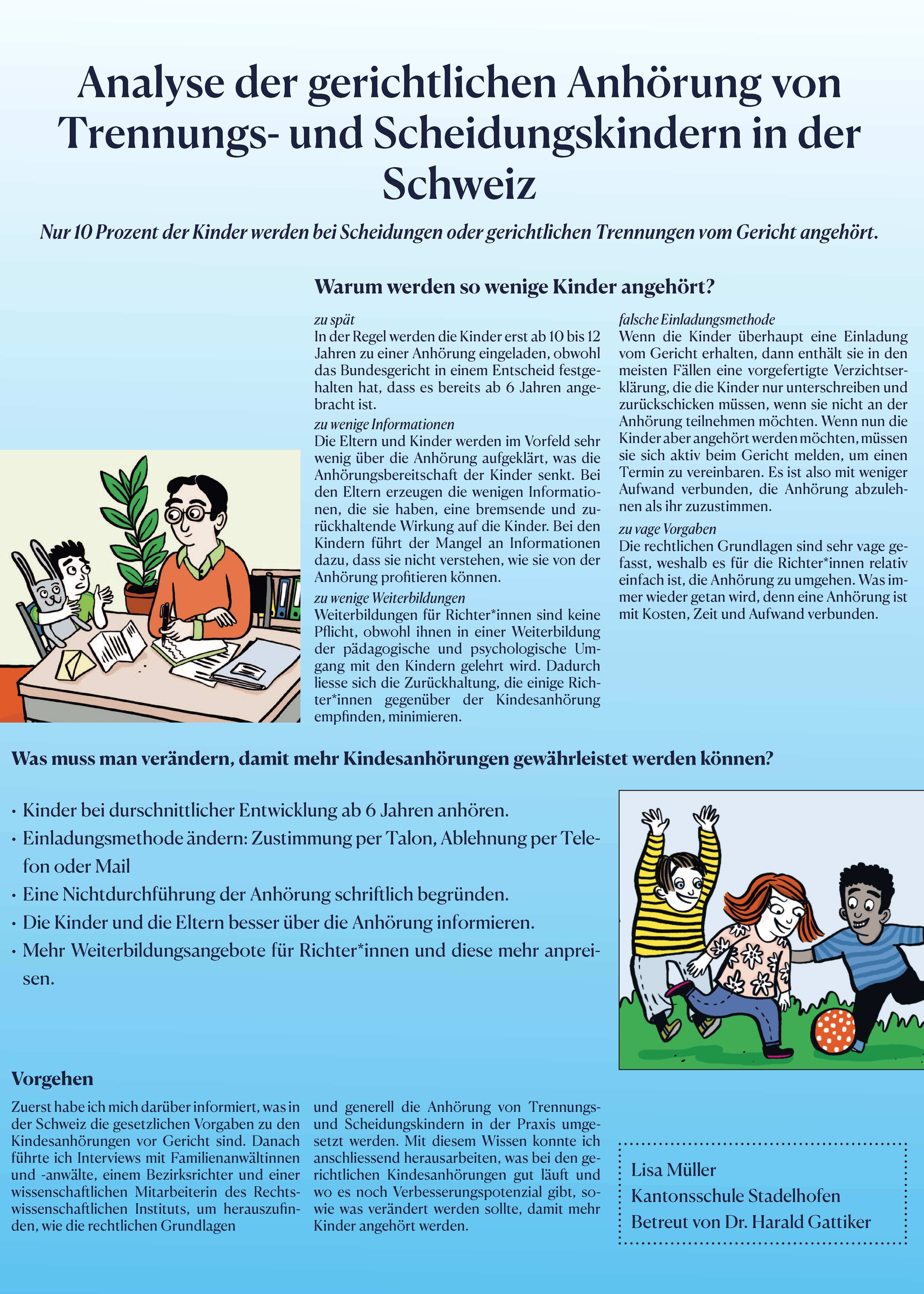Es ist heute nicht selbstverständlich, dass jedes Kind, dessen Eltern sich in einem Trennungs- oder Scheidungsverfahren befinden, die Möglichkeit erhält, angehört zu werden. Das Ziel meiner Arbeit bestand darin, die Gründe für dieses Phänomen zu finden und Anregungen zu machen, wie man die Situation ändern könnte. Im Laufe meiner Arbeit analysierte ich zuerst die juristischen Voraussetzungen. Anschliessend habe ich sieben Fachpersonen, die in diesem Bereich tätig sind, interviewt, um herauszufinden, wie die rechtlichen Grundlagen in der Praxis umgesetzt werden. Dadurch konnte ich am Schluss beurteilen, was im Vorgang der Kindesanhörung am Gericht schon gut läuft und wo es noch Verbesserungspotenzial gibt. Ich habe konkrete Änderungsvorschläge formuliert, die meiner Meinung nach dazu führen würden, dass mehr Kinder angehört werden. Ich habe herausgefunden, dass die Gründe für die zu wenig zahlreichen Anhörungen sehr vielschichtig sind. So ist die Zurückhaltung gewisser Richter*innen genauso ausschlaggebend wie eine falsch gewählte Einladungsmethode und das Unwissen der Eltern wie auch der Kinder. Mit meiner Arbeit erhoffe ich, eine Veränderung in Richtung mehr Kindesanhörungen in Trennungs- und Scheidungsverfahren bewirken zu können.