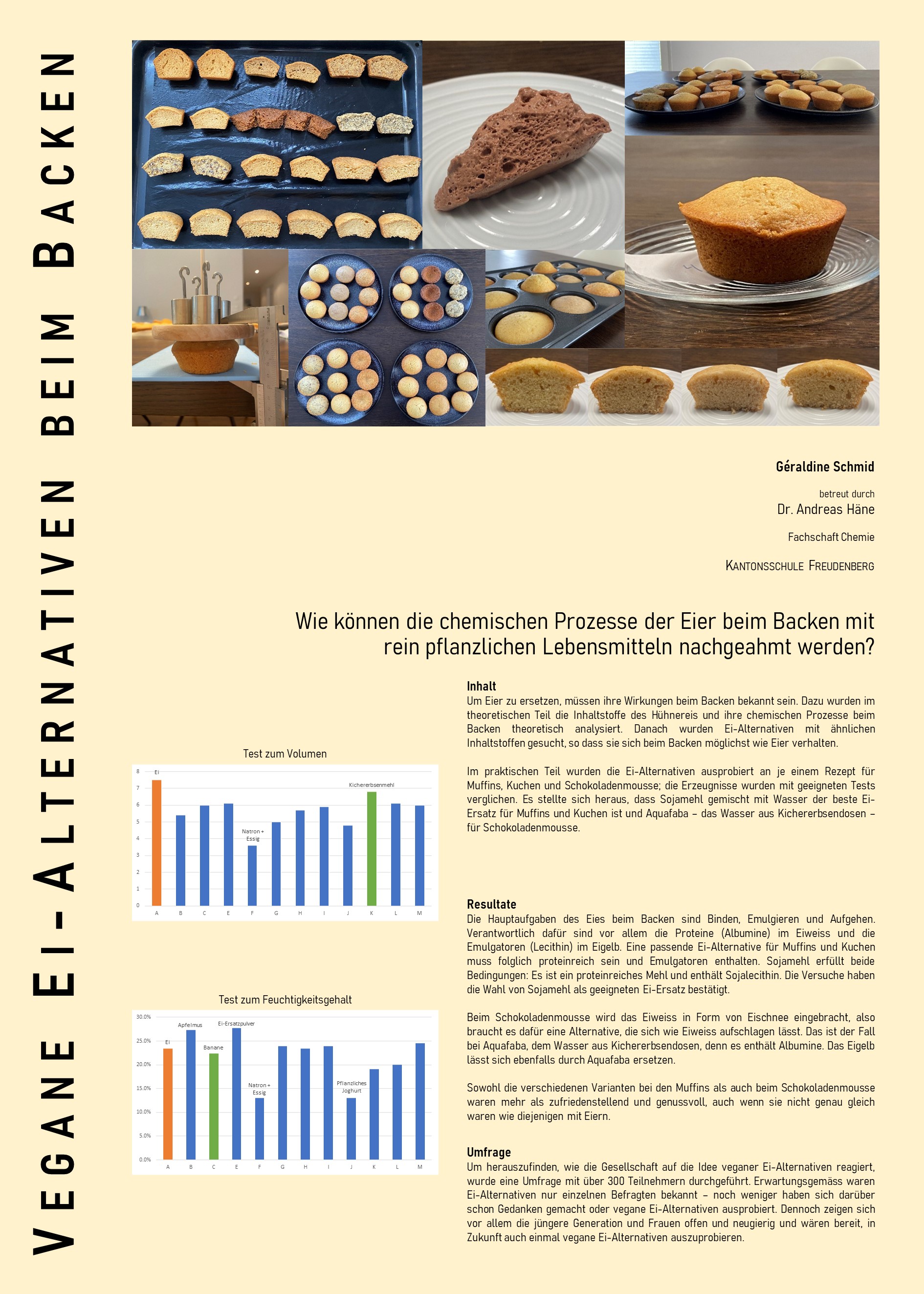 Der Klimawandel ist ein allgegenwärtiges Thema, und viele machen sich Gedanken, wie sie klima-freundlicher leben können. Eine Möglichkeit ist, den Konsum tierischer Produkte zu reduzieren. In dieser Arbeit geht es konkret um den Ersatz von Eiern beim Backen, da vegane Ei-Alternativen bisher wenig bekannt sind. Es wurden verschiedene Ei-Alternativen getestet und verglichen. Gesucht wurde sowohl eine Ei-Alternative für Kuchen und Muffins als auch eine für Schokoladenmousse. Um die optimale Alternative zu finden, wurden zuerst die Inhaltsstoffe des Eies theoretisch analysiert. So wurde rasch klar, welcher Inhaltsstoff für welche Wirkung des Eies beim Backen verantwortlich ist. Dann wurden mögliche Alternativen gesucht, die diese Wirkungen mit Hilfe ähnlicher Inhaltsstoffe nachahmen können. Die Ei-Alternativen wurden in mehreren Versuchsreihen auf ihre Eignung getestet. In den ersten vier Versuchen lag der Fokus auf einer passenden Ei-Alternative für Muffins und Kuchen, im letzten Versuch ging es um die Ei-Alternative für ein Schokoladenmousse. Es stellte sich heraus, dass für Muffins und Kuchen Sojamehl am besten als Ei-Ersatz geeignet ist; bei Schokoladenmousse ist es hingegen Aquafaba – das Wasser aus Kichererbsenbüchsen, das sich wie Eiweiss aufschlagen lässt. Zusätzlich wurde eine Umfrage über die Akzeptanz von veganen Ei-Alternativen durchgeführt. Wie erwartet, ist das Thema für die Mehrheit der Befragten neu. Dennoch können sich vor allem die jüngere Generation und Frauen vermehrt vorstellen, künftig einmal vegane Ei-Alternativen zu verwenden.
