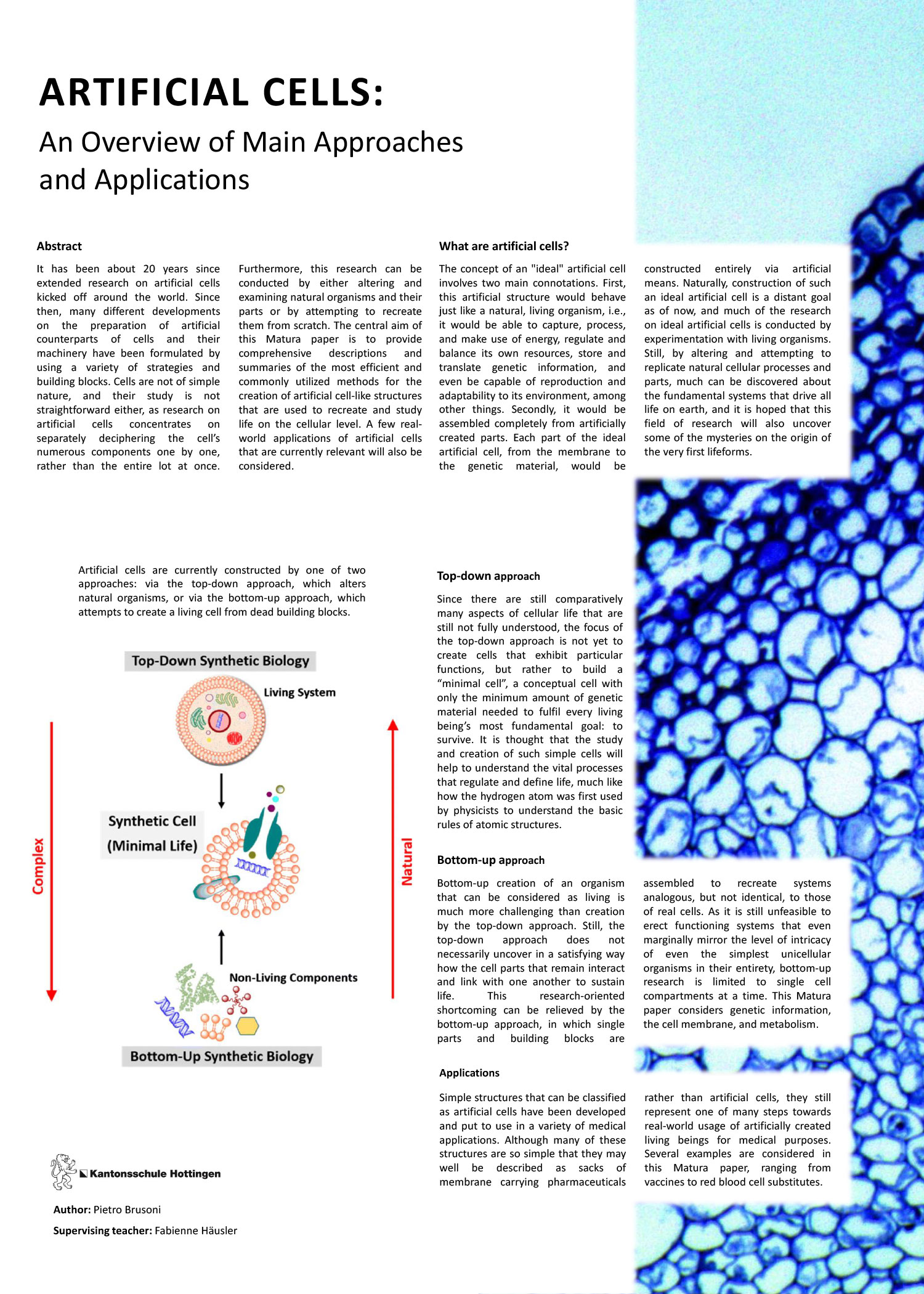 It has been about 20 years since extended research on artificial cells kicked off around the world. Since then, many different developments on the preparation of artificial counterparts of cells and their machinery have been formulated by using a variety of strategies and building blocks. Cells are not of simple nature, and their study is not straightforward either, as research on artificial cells concentrates on separately deciphering the cell’s numerous components one by one, rather than the entire lot at once. Furthermore, this research can be conducted by either altering and examining natural organisms and their parts or by attempting to recreate them from scratch. The central aim of this Matura paper is to provide comprehensive descriptions and summaries of the most efficient and commonly utilized methods for the creation of artificial cell-like structures that are used to recreate and study life on the cellular level. A few real-world applications of artificial cells that are currently relevant will also be considered.