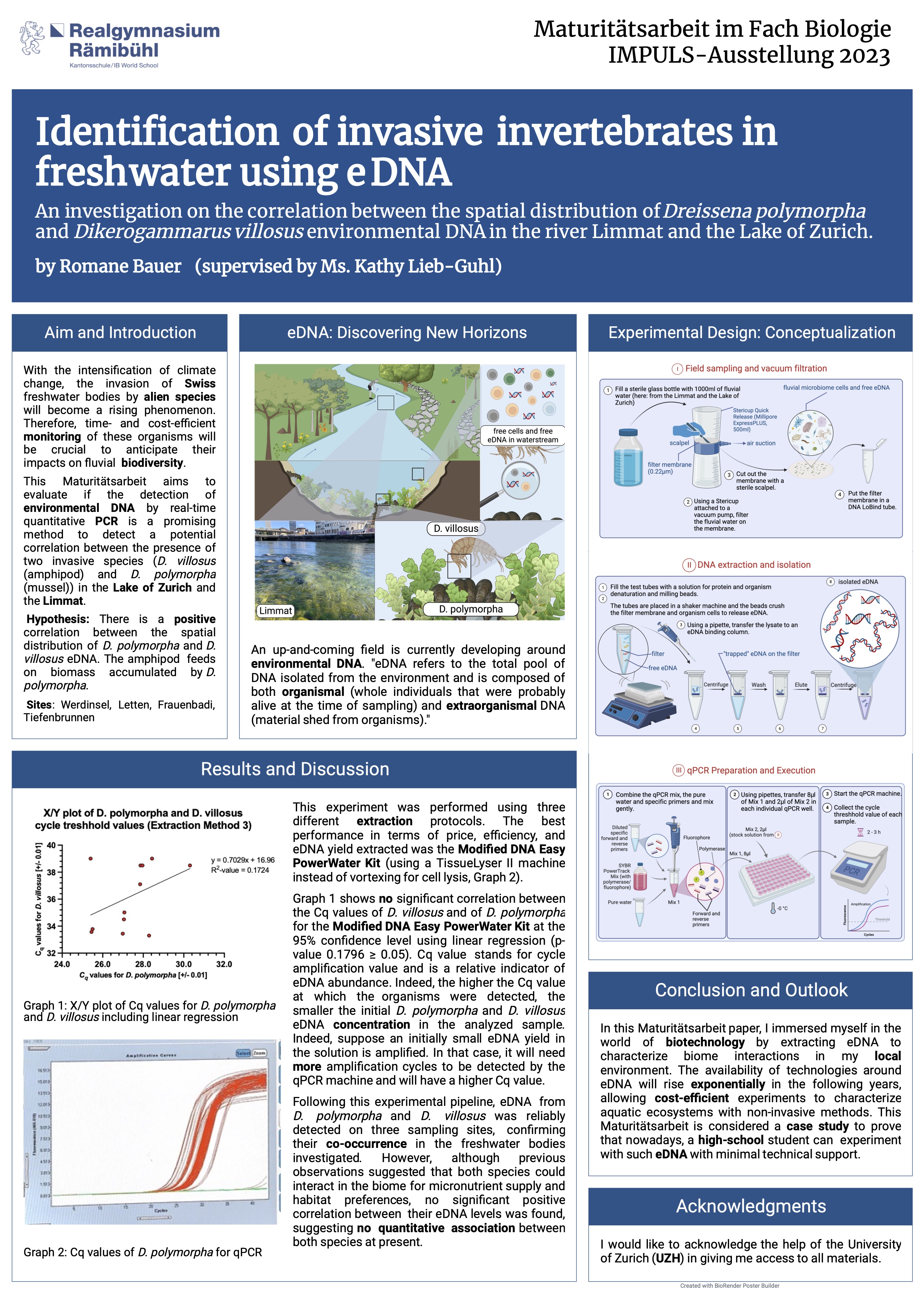 This Maturitätsarbeit provided me with the fantastic opportunity to combine the use of modern state-of-the-art technology involving eDNA to the tackling of aquatic bioecological issues in my local environment, and thus to become involved in the current efforts for ecosystem protection that are vital to my generation and all Zurich inhabitants.
