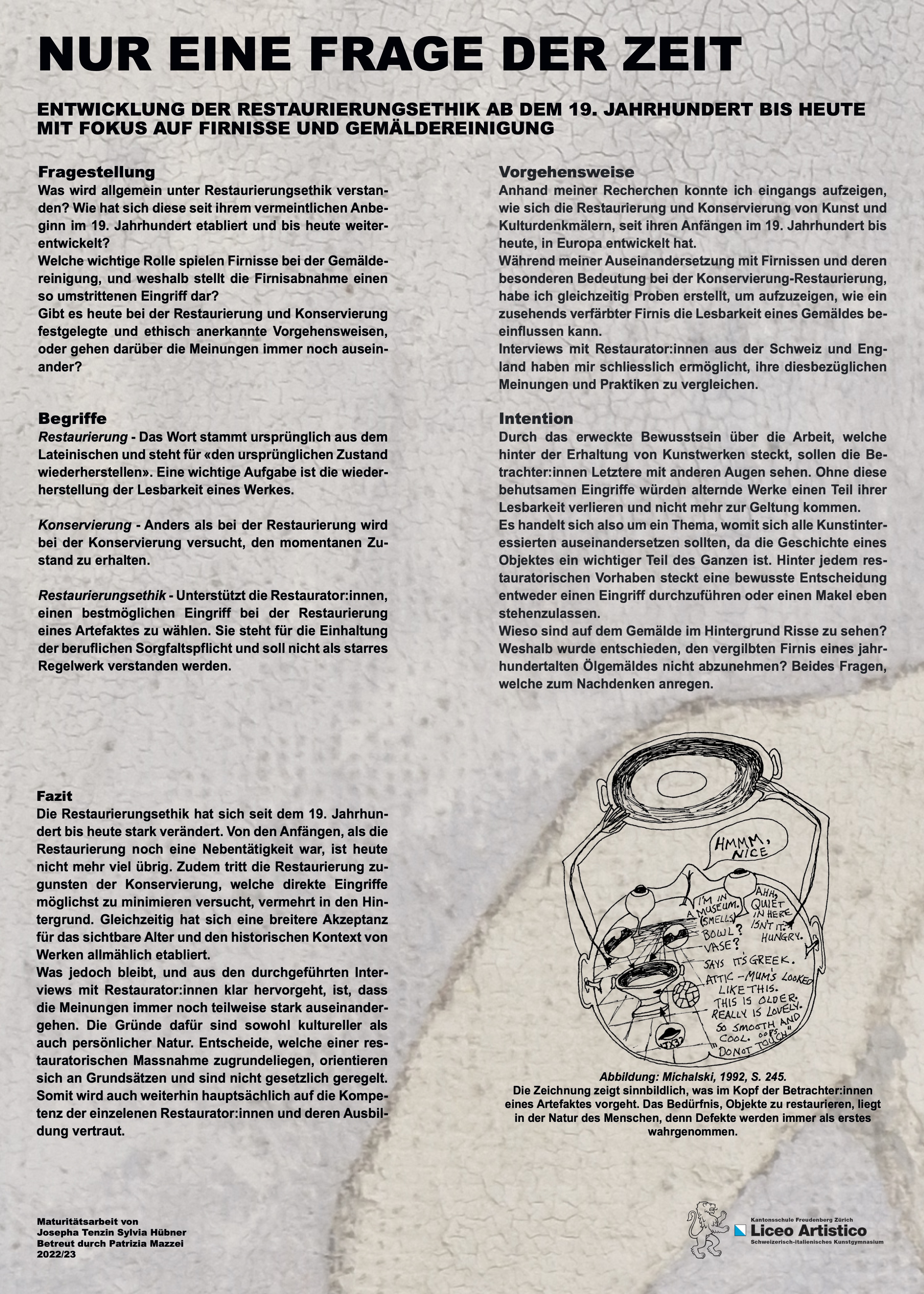 Den Betrachter:innen eines Kunstwerkes ist oft nicht bewusst, wieviel Arbeit sich hinter dessen Erhaltung verbirgt. Ich habe mir in meiner Arbeit das Ziel gesetzt, die Vielschichtigkeit der Restaurierung und Konservierung aufzuzeigen.