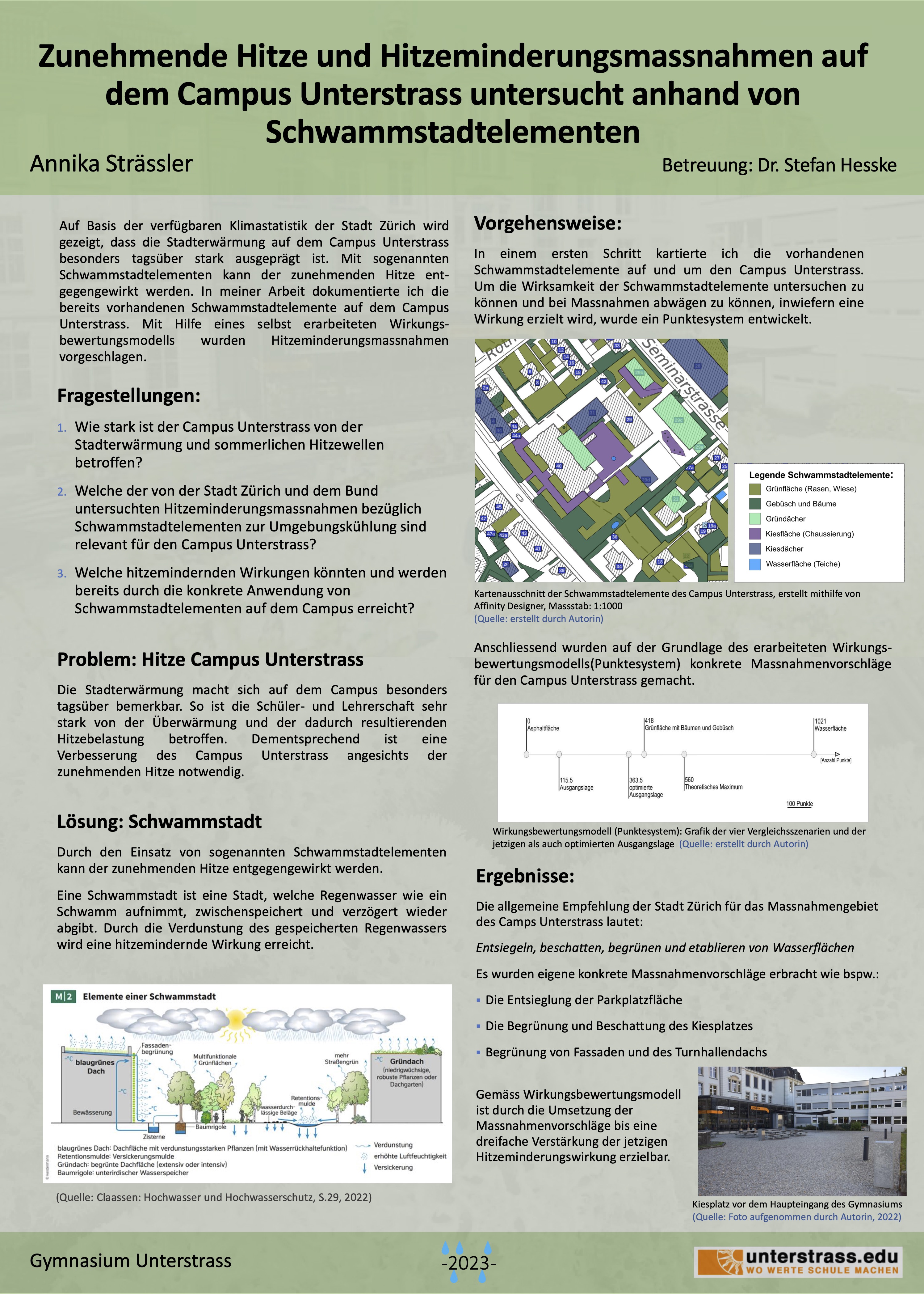 Als Teil meiner Arbeit kartierte ich die Schwammstadtelemente auf dem Schulareal und in der Umgebung. Zur Bewertung des jetzigen Zustandes und möglichen Verbesserungsszenarien wurde ein Wirkungsbewertungsmodell (Punktesystem) erarbeitet, mit welchem sich die positiven Auswirkungen von verschiedenen Kombinationen von Schwammstadtelementen zur Hitzeminderung vergleichen lassen. Basierend auf diesem wurden eigene konkrete Massnahmenvorschläge für den Campus Unterstrass erbracht.