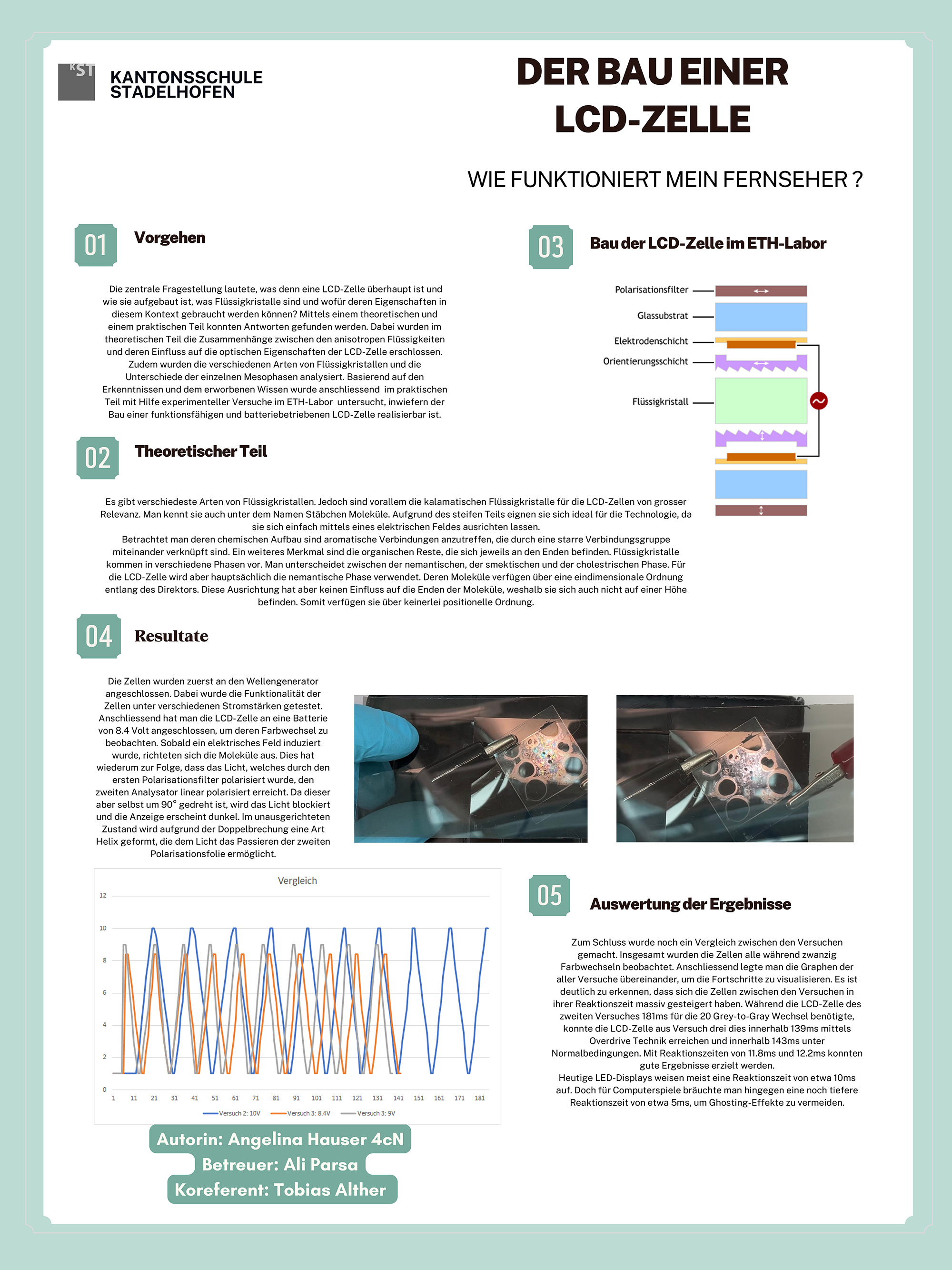 Die meisten von uns sitzen tagtäglich vor dem Bildschirm, ohne auch nur einen blassen Schimmer zu haben, was im Inneren des Fernsehers vor sich geht. Im Rahmen dieser Maturaarbeit wird das Geheimnis des Kindheitsfernsehers gelüftet. Insbesondere befasst sich diese Arbeit mit der LCD-Technologie. Mittels eines theoretischen und eines praktischen Teils wird erklärt, wie eine LCD-Zelle aufgebaut ist und wie Flüssigkristalle in diesem Zusammenhang gebraucht werden können.