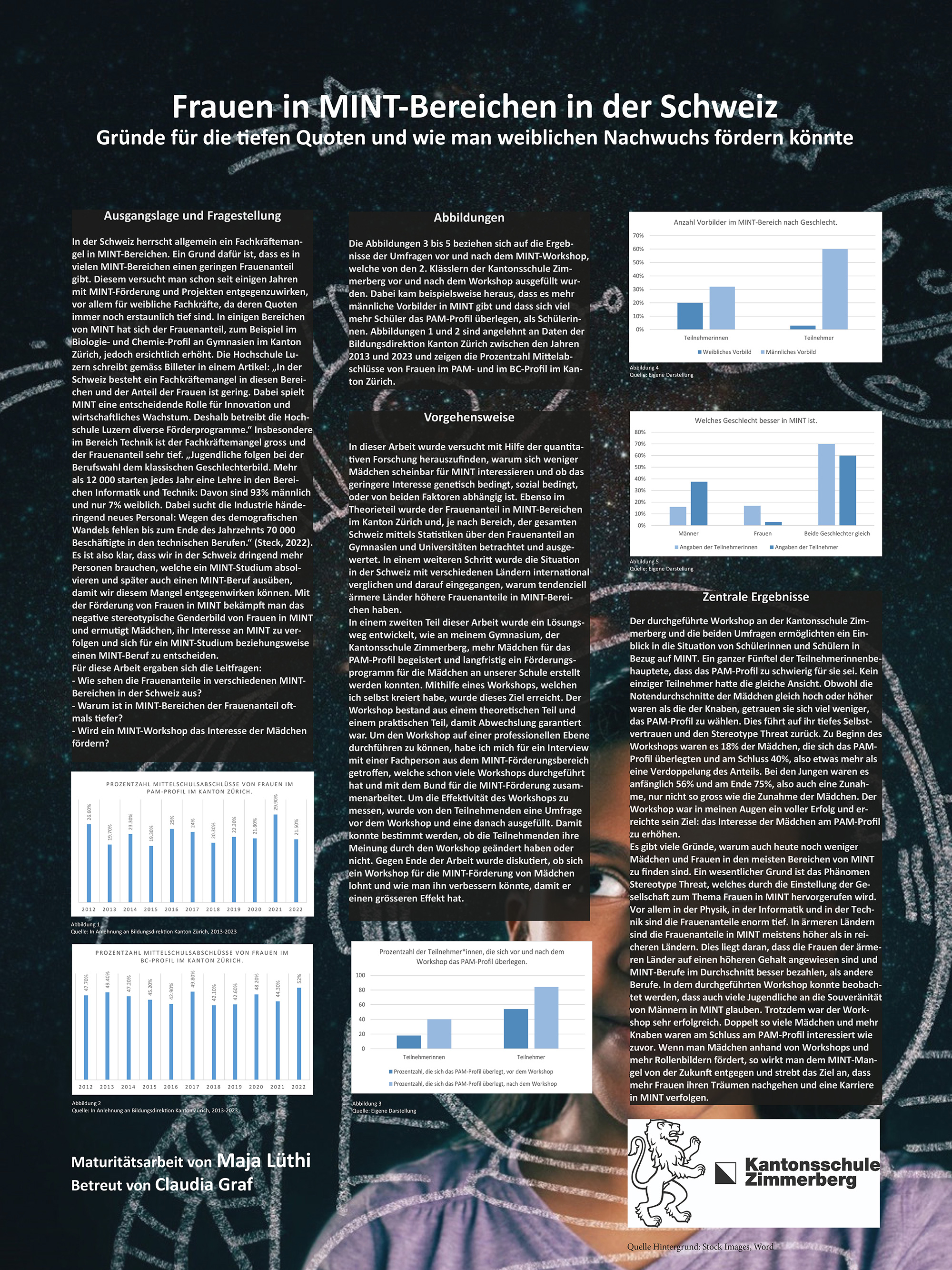 Es stellte sich heraus, dass es in der Schweiz immer noch typische Rollenbilder gibt und MINT-Berufe oft als etwas Männliches angesehen werden. Dadurch wird der sogenannte Stereotype Threat ausgelöst, weshalb sich Mädchen und Frauen von MINT-Bereichen fernhalten. Für jungen weiblichen Nachwuchs fehlt die Präsenz von weiblichen Rollenvorbildern in diesem Bereich. Weiter zeigte sich, dass ein im Rahmen dieser Arbeit durchgeführter MINT-Workshop einen grossen Einfluss hatte und sich danach doppelt so viele Mädchen interessierten wie zu Beginn.
