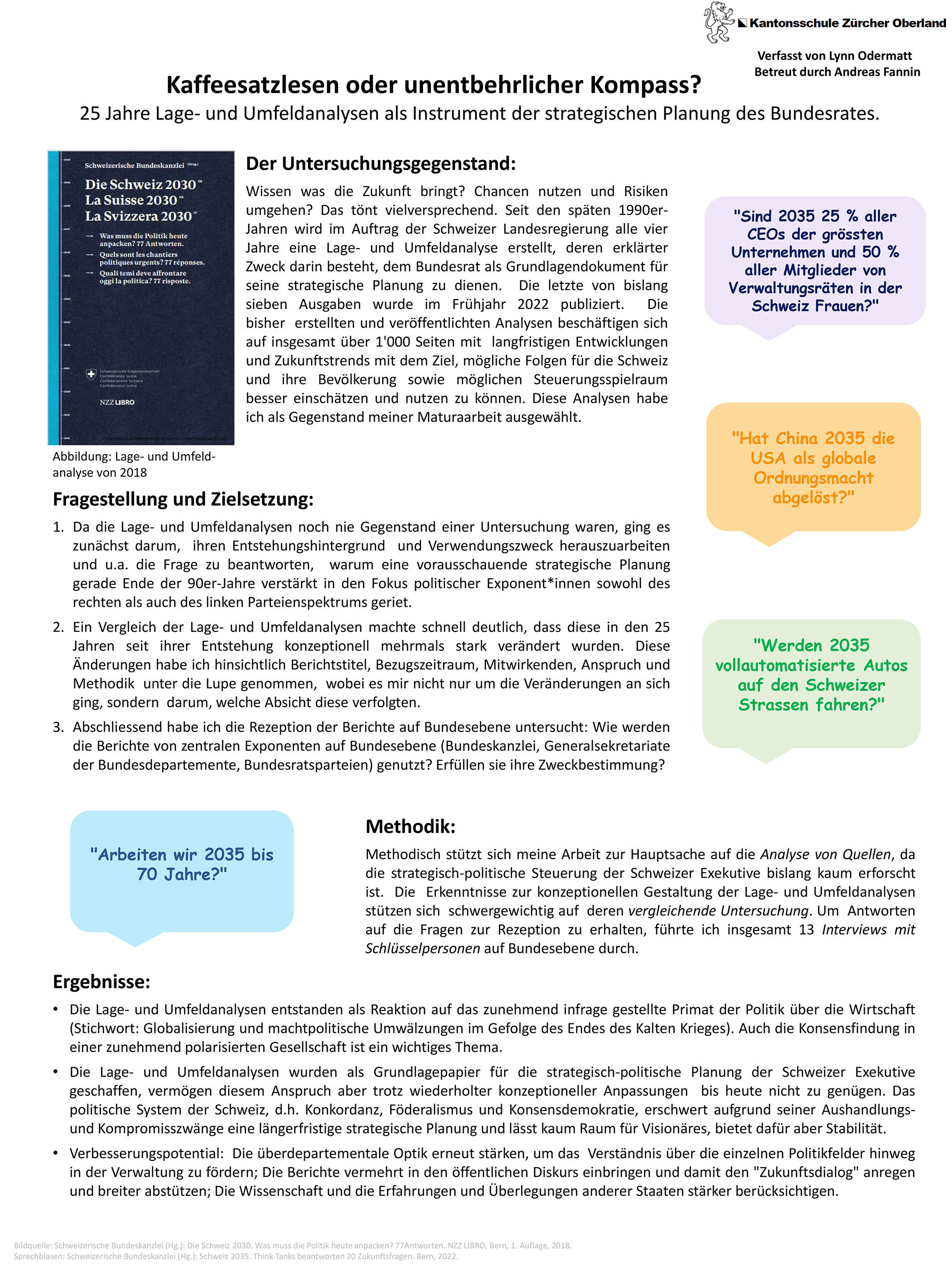 Unsere Welt ist zunehmend stärker vernetzt, wodurch Problemstellungen je länger je komplexer werden. Kein Wunder entsteht da der Wunsch, sich mit Blick auf die Zukunft eine Planungsgrundlage zu verschaffen. Vor diesem Hintergrund lässt der Bundesrat seit den späten 90er-Jahren unter der Leitung der Bundeskanzlei alle vier Jahre eine Lage- und Umfeldanalyse als Grundlage für seine Legislaturplanung erstellen. Meine Arbeit beleuchtet zunächst die Entstehungshintergründe und den Zweck dieser Berichte. Anschliessend untersucht sie anhand einer vergleichenden Betrachtung der sieben bisher publizierten Lage- und Umfeldanalysen die erheblichen konzeptionellen Veränderungen, denen diese über die letzten 25 Jahre hinweg unterzogen wurden. Abgestützt auf die Befragung wichtiger Akteure auf Bundesebene untersucht die Arbeit abschliessend deren Rezeption und Nutzung sowie das Verbesserungspotential für künftige Berichte.